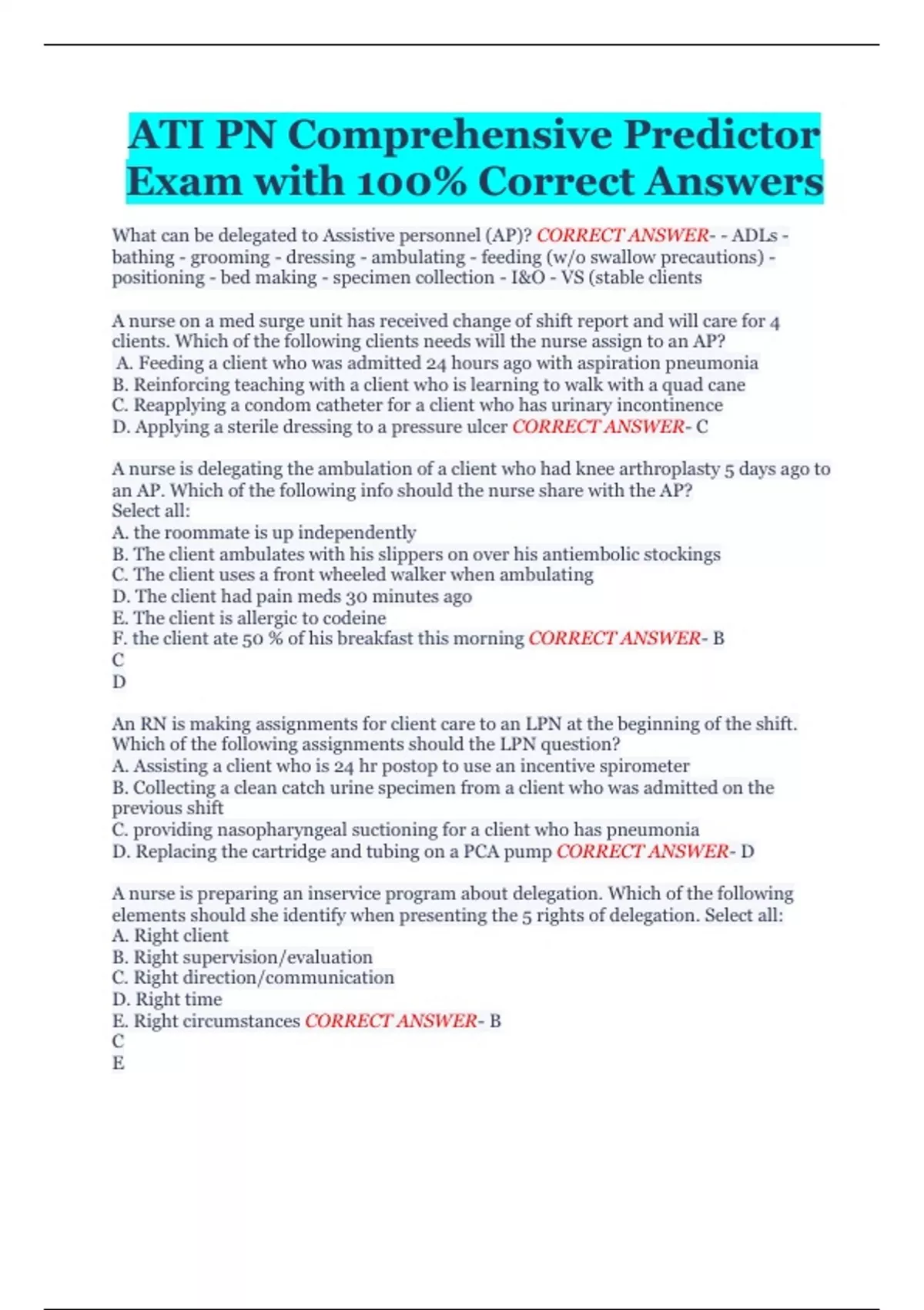 ATI PN Comprehensive Predictor Exam with 100% Correct Answers What can be delegated to Assistive personnel (AP)? A nurse on a med surge unit has received change of shift report and will care for 4 clients. Which of the following clients needs will the nurse assign to an AP? A nurse is delegating the ambulation of a client who had knee arthroplasty 5 days ago to an AP. Which of the following info should the nurse share with the AP? An RN is making assignments for client care to an LPN at the beginning of the shift. Which of the following assignments should the LPN question?
