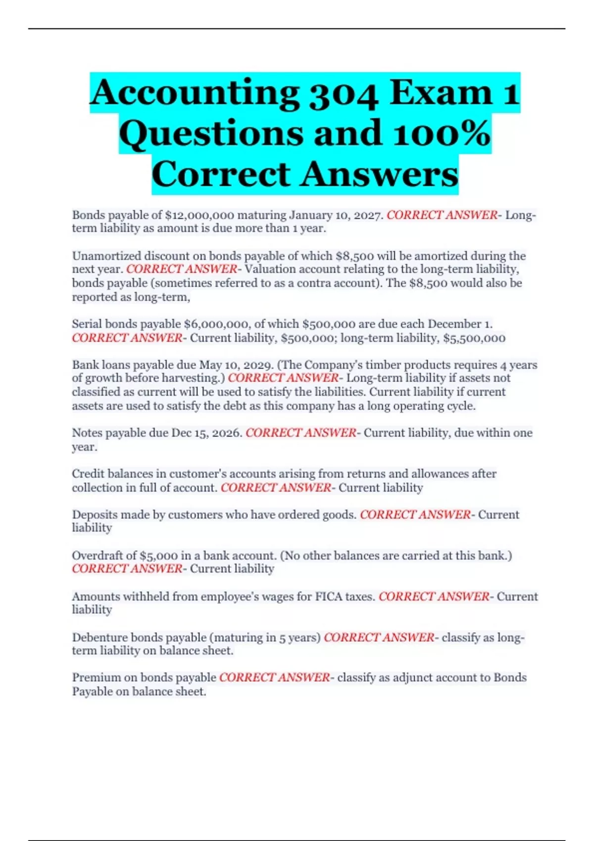 Accounting 304 Exam 1 Questions and 100% Correct Answers Bonds payable of $12,000,000 maturing January 10, 2027. CORRECT ANSWER- Longterm liability as amount is due more than 1 year. Unamortized discount on bonds payable of which $8,500 will be amortized during the next year. CORRECT ANSWER- Valuation account relating to the long-term liability, bonds payable (sometimes referred to as a contra account). The $8,500 would also be reported as long-term, Serial bonds payable $6,000,000, of which $500,000 are due each December 1. CORRECT ANSWER- Current liability, $500,000; long-term liability, $5,500,000 Bank loans payable due May 10, 2029. (The Company's timber products requires 4 years of growth before harvesting.) CORRECT ANSWER- Long-term liability if assets not classified as current will be used to satisfy the liabilities. Current liability if current assets are used to satisfy the debt as this company has a long operating cycle. Notes payable due Dec 15, 2026. CORRECT ANSWER- Current liability, due within one year.