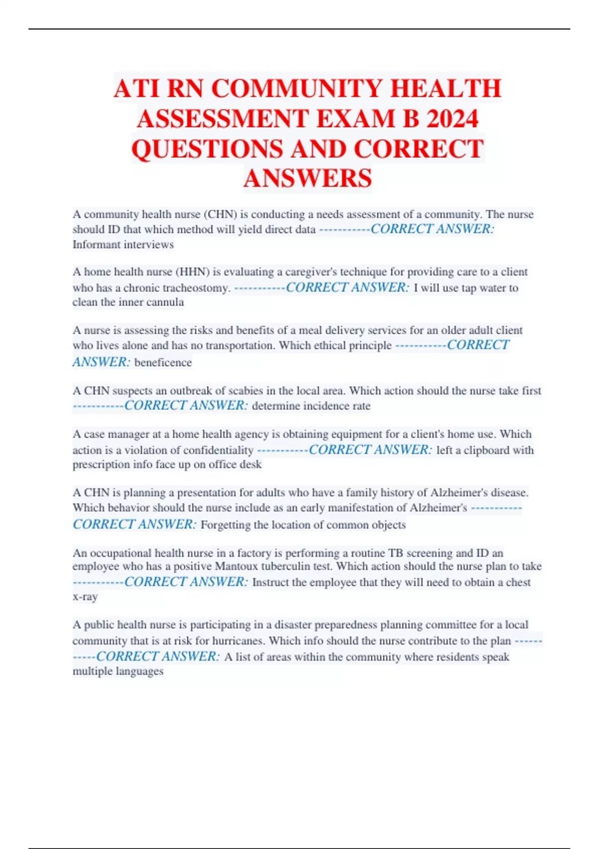 ATI RN COMMUNITY HEALTH ASSESSMENT EXAM B 2024 QUESTIONS AND CORRECT ANSWERS