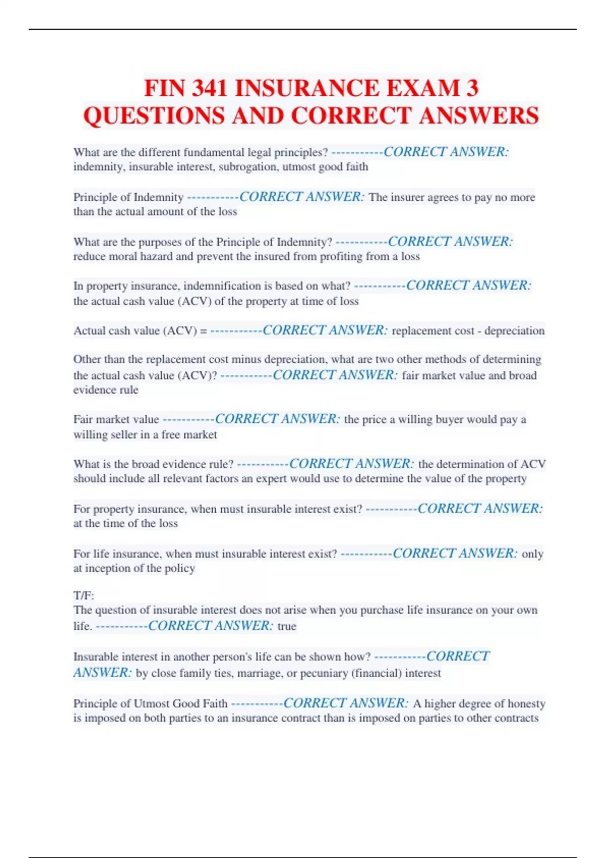 fin 341 insurance exam 3 questions and correct ans