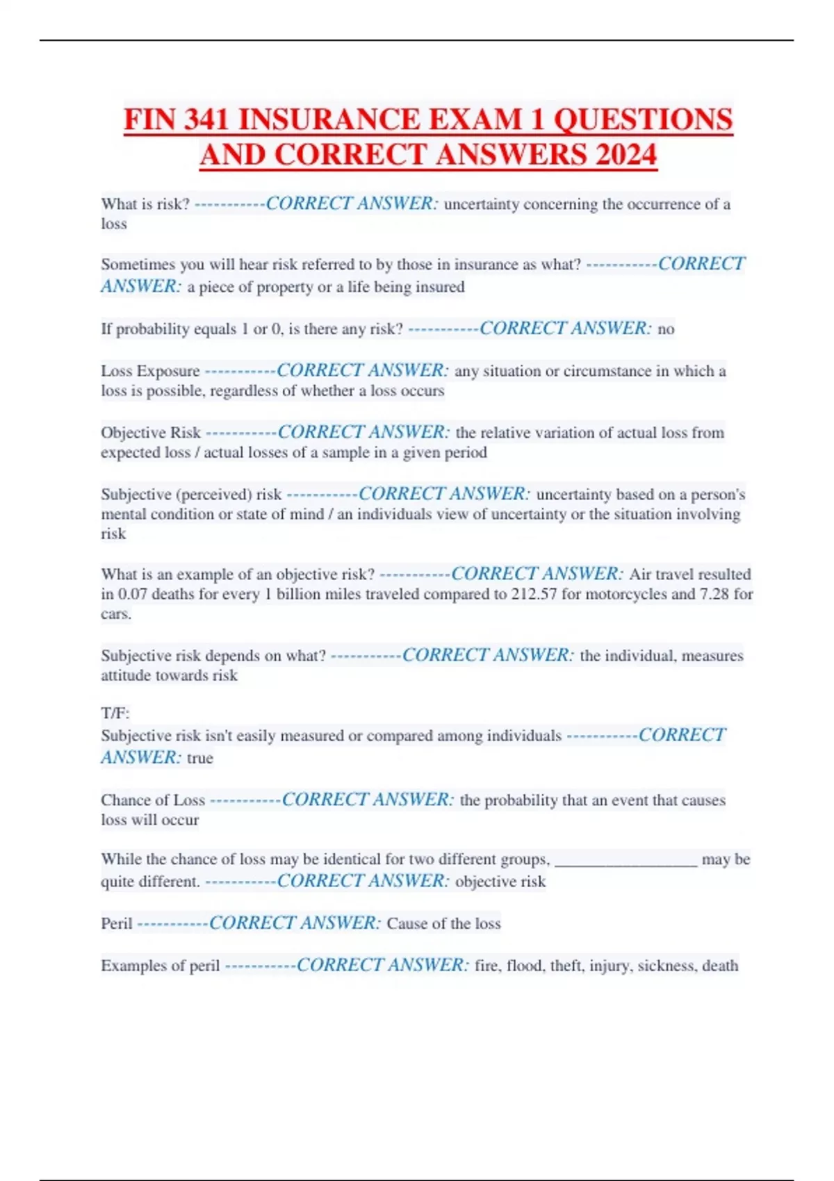 fin 341 insurance exam 1 questions and correct ans
