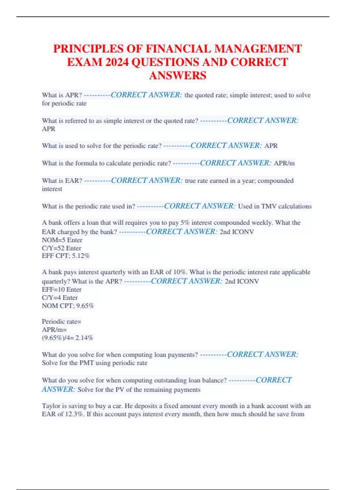 PRINCIPLES OF FINANCIAL MANAGEMENT EXAM 2024 QUESTIONS AND CORRECT ANSWERS
