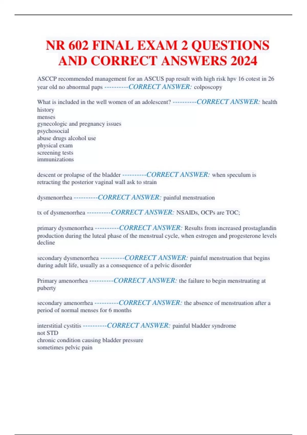 NR 602 FINAL EXAM 2 QUESTIONS AND CORRECT ANSWERS 2024