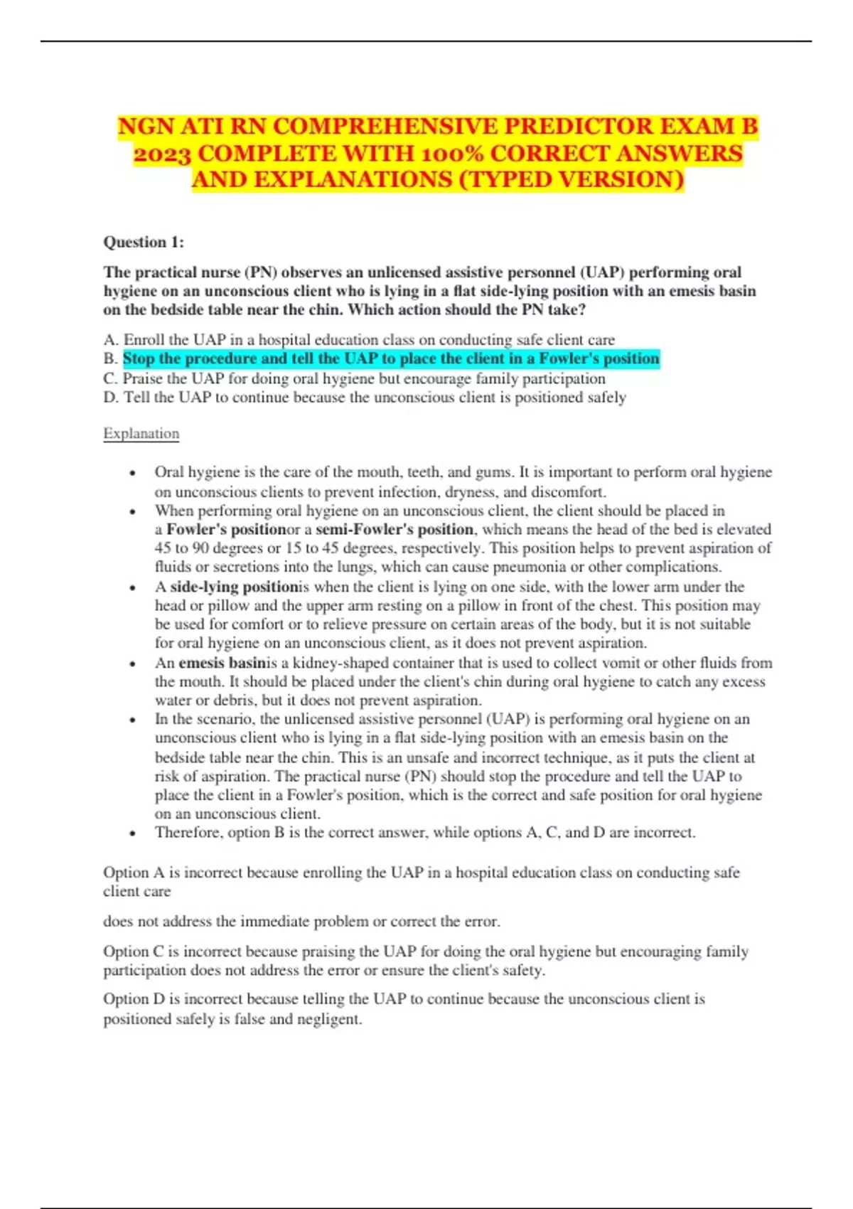 NGN ATI RN COMPREHENSIVE PREDICTOR EXAM B 2023 COMPLETE WITH 100% CORRECT ANSWERS AND EXPLANATIONS REAL TYPED VERSION