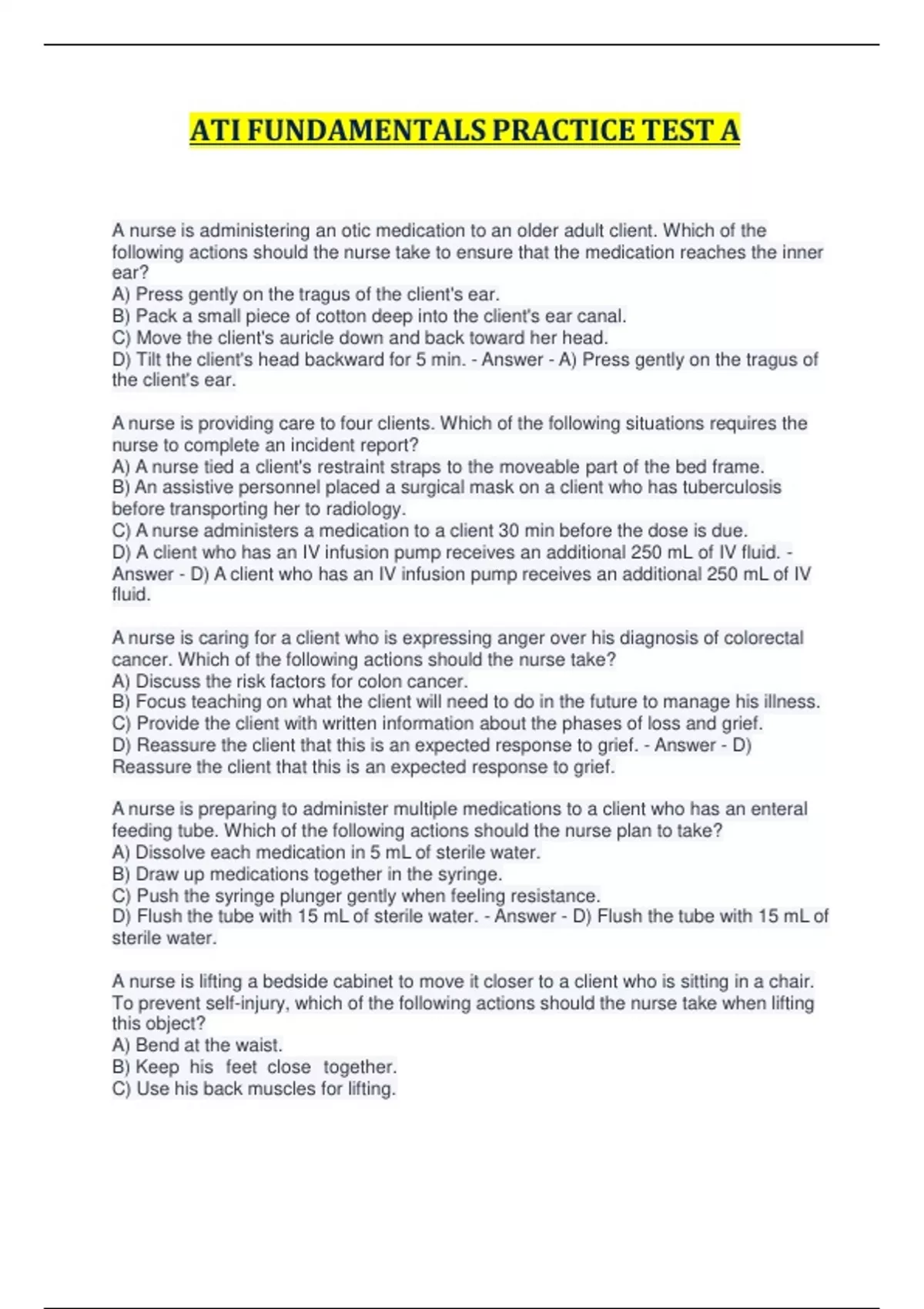 ATI FUNDAMENTALS PRACTICE TEST A A nurse is administering an otic medication to an older adult client. Which of the following actions should the nurse take to ensure that the medication reaches the inner ear? A) Press gently on the tragus of the client's ear. B) Pack a small piece of cotton deep into the client's ear canal. C) Move the client's auricle down and back toward her head. D) Tilt the client's head backward for 5 min. - Answer - A) Press gently on the tragus of the client's ear. A nurse is providing care to four clients. Which of the following situations requires the nurse to complete an incident report? A) A nurse tied a client's restraint straps to the moveable part of the bed frame. B) An assistive personnel placed a surgical mask on a client who has tuberculosis before transporting her to radiology. C) A nurse administers a medication to a client 30 min before the dose is due. D) A client who has an IV infusion pump receives an additional 250 mL of IV fluid. - Answer - D) A client who has an IV infusion pump receives an additional 250 mL of IV fluid. A nurse is caring for a client who is expressing anger over his diagnosis of colorectal cancer. Which of the following actions should the nurse take? A) Discuss the risk factors for colon cancer. B) Focus teaching on what the client will need to do in the future to manage his illness. C) Provide the client with written information about the phases of loss and grief. D) Reassure the client that this is an expected response to grief. - Answer - D) Reassure the client that this is an expected response to grief. A nurse is preparing to administer multiple medications to a client who has an enteral feeding tube. Which of the following actions should the nurse plan to take? A) Dissolve each medication in 5 mL of sterile water. B) Draw up medications together in the syringe. C) Push the syringe plunger gently when feeling resistance. D) Flush the tube with 15 mL of sterile water. - Answer - D) Flush the tube with 15 mL of sterile water. A nurse is lifting a bedside cabinet to move it closer to a client who is sitting in a chair. To prevent self-injury, which of the following actions should the nurse take when lifting this object? A) Bend at the waist. B) Keep his feet close together. C) Use his back muscles for lifting. D) Stand close to the cabinet when lifting it. - Answer - D) Stand close to the cabinet when lifting it. A nurse is caring for a client who reports pain. When documenting the quality of the client's pain on an initial pain assessment, the nurse should record which of the following client statements? A) "I'm having mild pain." B) "The pain is like a dull ache in my stomach." C) "I notice that the pain gets worse after I eat." D) "The pain makes me feel nauseous." - Answer - B) "The pain is like a dull ache in my stomach." A nurse is reviewing a client's fluid and electrolyte status. Which of the following findings should the nurse report to the provider? A) BUN 15 mg/dL B) Creatinine 0.8 mg/dL C) Sodium 143 mEq/L D) Potassium 5.4 mEq/L - Answer - D) Potassium 5.4 mEq/L A nurse is evaluating a client's use of a cane. Which of the following actions should the nurse identify as an indication of correct use? A) The top of the cane is parallel to the client's waist. B) When walking, the client moves the cane 46 cm (18 in) forward. C) The client holds the cane on the stronger side of her body. D) The client moves her stronger limb forward with the cane. - Answer - C) The client holds the cane on the stronger side of her body. A nurse is assisting a client who is postoperative with the use of an incentive spirometer. Into which of the following positions should the nurse place the client? A) Side-lying B) Supine C) Semi-Fowler's D) Trendelenburg - Answer - C) Semi-Fowler's A charge nurse is discussing the responsibility of nurses caring for clients who have a Clostridium difficile infection. Which of the following information should the nurse include in the teaching? A) Assign the client to a room with a negative air-flow system. B) Use alcohol-based hand sanitizer when leaving the client's room. C) Clean contaminated surfaces in the client's room with a phenol solution. D) Have family members wear a gown and gloves when visiting. - Answer - D) Have family members wear a gown and gloves when visiting. A nurse is preparing to administer an injection of an opioid medication to a client. The nurse draws out 1 mL of the medication from a 2 mL vial. Which of the following actions should the nurse take? A) Ask another nurse to observe the medication wastage. B) Notify the pharmacy when wasting the medication. C) Lock the remaining medication in the controlled substances cabinet. D) Dispose of the vial with the remaining medication in a sharps container. - Answer - A) Ask another nurse to observe the medication wastage. A nurse is performing a peripheral vascular assessment for a client. When placing the bell of the stethoscope on the client's neck, she hears the following sound. This sound indicates which of the following? (Click on the audio button to listen to the clip.) A) Narrowed arterial lumen B) Distended jugular veins C) Impaired ventricular contraction D) Asynchronous closure of the aortic and pulmonic valves - Answer - A) Narrowed arterial lumen A nurse is using an open irrigation technique to irrigate a client's indwelling urinary catheter. Which of the following actions should the nurse take? A) Place the client in a side-lying position. B) Instill 15 mL of irrigation fluid into the catheter with each flush. C) Subtract the amount of irrigant used from the client's urine output. D) Perform the irrigation using a 20-mL syringe. - Answer - C) Subtract the amount of irrigant used from the client's urine output.