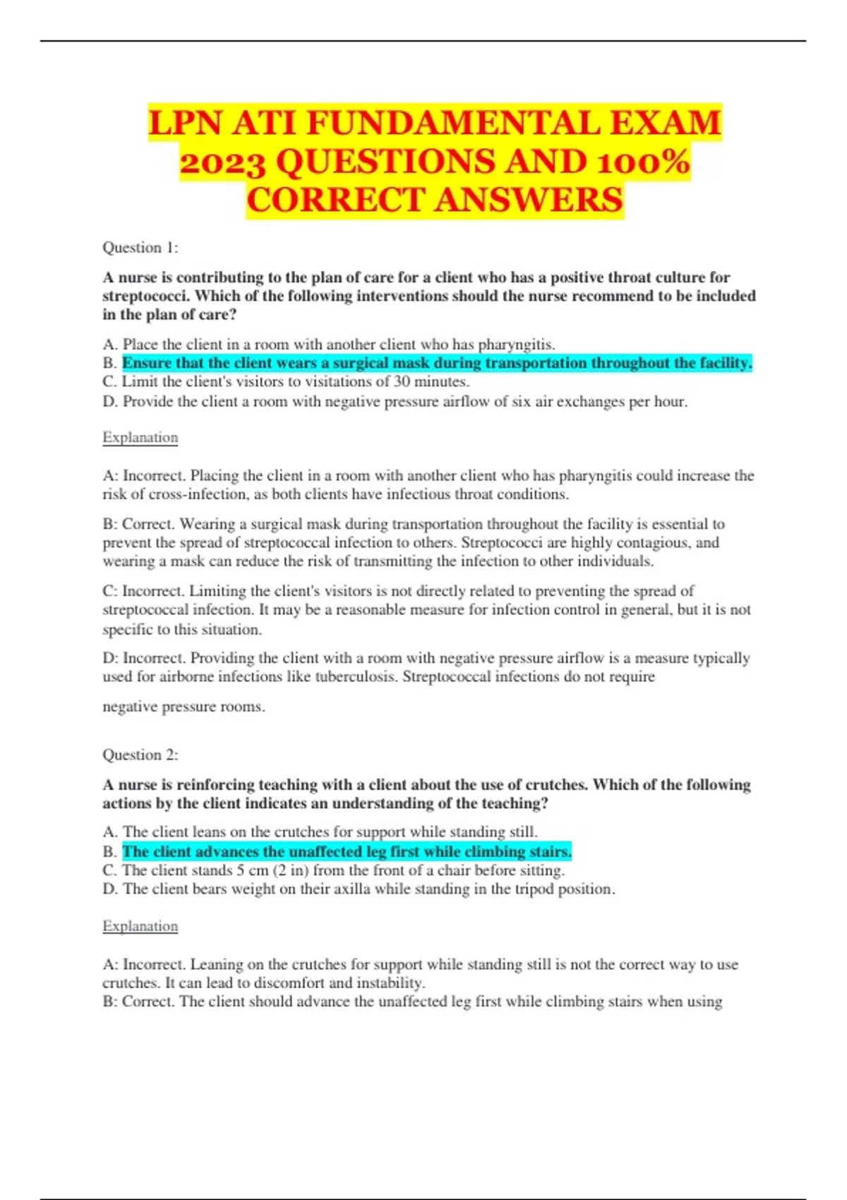 LPN ATI FUNDAMENTAL EXAM 2023 QUESTIONS AND 100% CORRECT ANSWERS Question 1: A nurse is contributing to the plan of care for a client who has a positive throat culture for streptococci. Which of the following interventions should the nurse recommend to be included in the plan of care? A. Place the client in a room wit h another client who has pharyngitis. B. Ensure that the client wears a surgical mask during transportation throughout the facility. C. Limit the client's visitors to visitations of 30 minutes. D. Provide the client a room with negative pressure airflow of si x air exchanges per hour. Explanation A: Incorrect. Placing the client in a room with another client who has pharyngitis could increase the risk of cross -infection, as both clients have infectious throat conditions. B: Correct. Wearing a surgical mask du ring transportation throughout the facility is essential to prevent the spread of streptococcal infection to others. Streptococci are highly contagious, and wearing a mask can reduce the risk of transmitting the infection to other individuals. C: Incorrect . Limiting the client's visitors is not directly related to preventing the spread of streptococcal infection. It may be a reasonable measure for infection control in general, but it is not specific to this situation. D: Incorrect. Providing the client with a room with negative pressure airflow is a measure typically used for airborne infections like tuberculosis. Streptococcal infections do not require negative pressure rooms. Question 2: A nurse is reinforcing teaching with a client about the use of crutches. Which of the following actions by the client indicates an understanding of the teaching? A. The client leans on the crutches f or support while standing still. B. The client advances the unaffected leg first while climbing stairs. C. The client stands 5 cm (2 in) from the front of a chair before sitting. D. The client bears weight on their axilla while standing in the tripod position . Explanation A: Incorrect. Leaning on the crutches for support while standing still is not the correct way to use crutches. It can lead to discomfort and instability. B: Correct. The client should advance the unaffected leg first while climbing stairs w hen using crutches. This technique ensures better stability and safety during stair ascent. C: Incorrect. Standing 5 cm (2 in) from the front of a chair before sitting is not directly related to the use of crutches. D: Incorrect. Bearing weight on the axil la while standing in the tripod position is not the correct way to use crutches. The tripod position is used for resting, not weight bearing. Question 3: A nurse is assisting with the plan of care for four clients. Which of the following tasks should the nurse assign to an assistive personnel (AP)? A. Ensure a client can use crutches before discharge. B. Check a client's ability to swal low following a stroke. C. Obtain a client's pain rating prior to physical therapy. D. Assist a client to get out of bed after a breathing treatment. Explanation A: Incorrect. Ensuring a client can use crutches before discharge requires clinical judgment a nd skilled assessment, so it should not be delegated to assistive personnel. B: Incorrect. Checking a client's ability to swallow following a stroke involves assessing the client's airway and potential risk of aspiration, which is a complex nursing task an d should not be delegated to assistive personnel. C: Incorrect. Obtaining a client's pain rating prior to physical therapy requires understanding the client's pain and its management, which should not be delegated to assistive personnel. D: Correct. Assist ing a client to get out of bed after a breathing treatment can be safely delegated to assistive personnel. It involves helping the client move, which is within the scope of their training. Question 4: A nurse is reinforcing teaching with a client about the use of crutches. Which of the following actions by the client indicates an understanding of the teaching? A. The client leans on th e crutches for support while standing still. B. The client advances the unaffected leg first while climbing stairs. C. The client stands 5 cm (2 in) from the front of a chair before sitting. D. The client bears weight on their axilla while standing in the tri pod position. Explanation A: Incorrect. Leaning on the crutches for support while standing still is not the correct way to use crutches. It can lead to discomfort and instability. B: Correct. The client should advance the unaffected leg first while climb ing stairs when using crutches. This technique ensures better stability and safety during stair ascent. C: Incorrect. Standing 5 cm (2 in) from the front of a chair before sitting is not directly related to the use of crutches. D: Incorrect. Bearing weight on the axilla while standing in the tripod position is not the correct way to use crutches. The tripod position is used f or resting, not weight bearing. Question 5: A nurse is caring for a postoperative client who is at risk for thrombus formation. Which of the following interventions should the nurse delegate to an assistive personnel (AP)? A. Apply thromboembolic stockings. B. Moni tor the circulation in all four extremities. C. Record the condition of the client's skin. Explanation A: Correct. Applying thromboembolic stockings (compression stockings) to the client's legs is a task that can be safely delegated to assistive personnel . The nurse should provide clear instructions on how to apply them properly. B: Incorrect. Monitoring the circulation in all four extremities requires clinical judgment and skilled assessment, and it should not be delegated to assistive personnel. C: Incor rect. Recording the condition of the client's skin requires observation and assessment, which should not be delegated to assistive personnel. Question 6: A nurse is reinforcing teaching about health promotion with a group of young adult clients. Which of the following 
