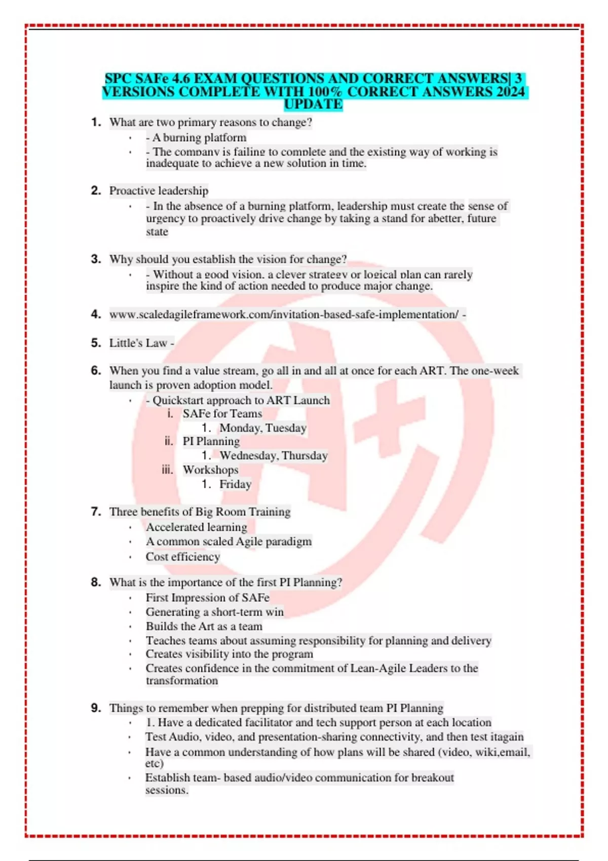 SPC SAFe 4.6 EXAM QUESTIONS AND CORRECT ANSWERS| 3 VERSIONS COMPLETE WITH 100% CORRECT ANSWERS 2024 UPDATE