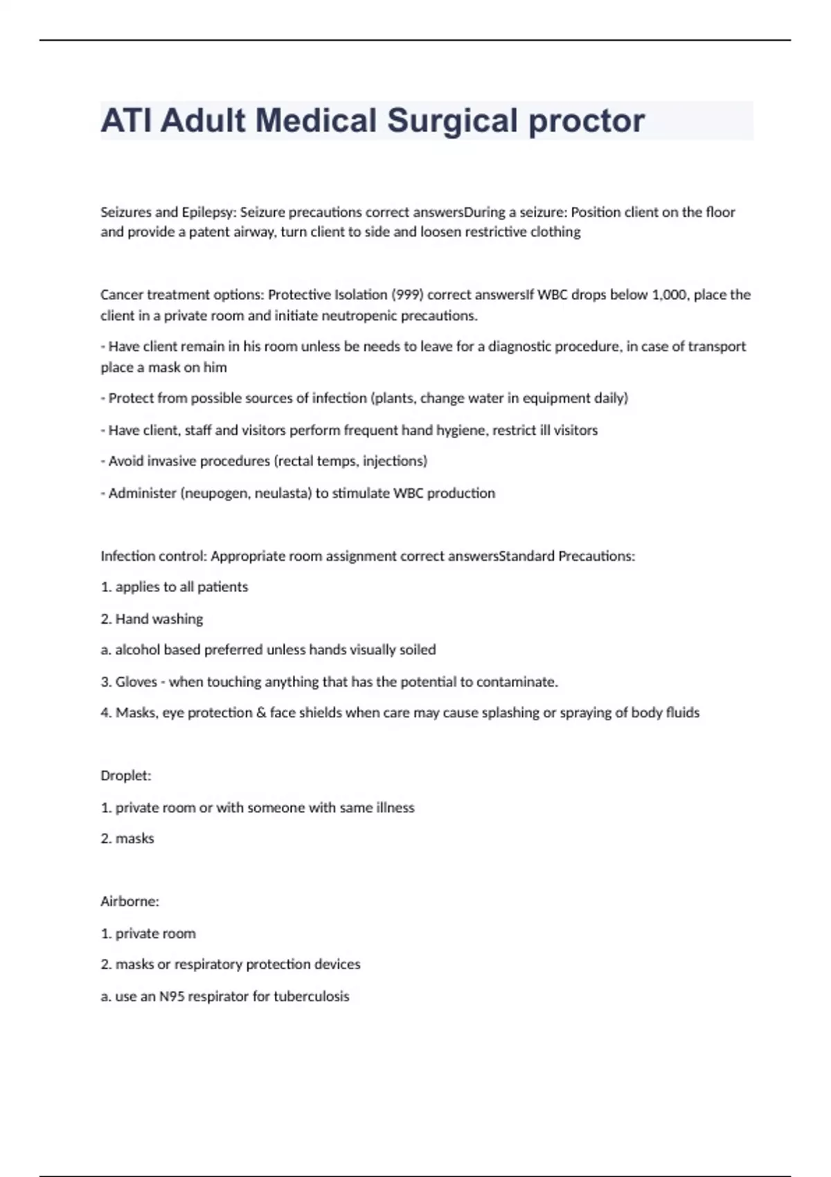 Seizures and Epilepsy: Seizure precautions correct answersDuring a seizure: Position client on the floor and provide a patent airway, turn client to side and loosen restrictive clothing Cancer treatment options: Protective Isolation (999) correct answersIf WBC drops below 1,000, place the client in a private room and initiate neutropenic precautions. - Have client remain in his room unless be needs to leave for a diagnostic procedure, in case of transport place a mask on him - Protect from possible sources of infection (plants, change water in equipment daily) - Have client, staff and visitors perform frequent hand hygiene, restrict ill visitors - Avoid invasive procedures (rectal temps, injections) - Administer (neupogen, neulasta) to stimulate WBC production Infection control: Appropriate room assignment correct answersStandard Precautions: 1. applies to all patients 2. Hand washing a. alcohol based preferred unless hands visually soiled 3. Gloves - when touching anything that has the potential to contaminate. 4. Masks, eye protection & face shields when care may cause splashing or spraying of body fluids Droplet: 1. private room or with someone with same illness 2. masks Airborne: 1. private room 2. masks or respiratory protection devices a. use an N95 respirator for tuberculosis