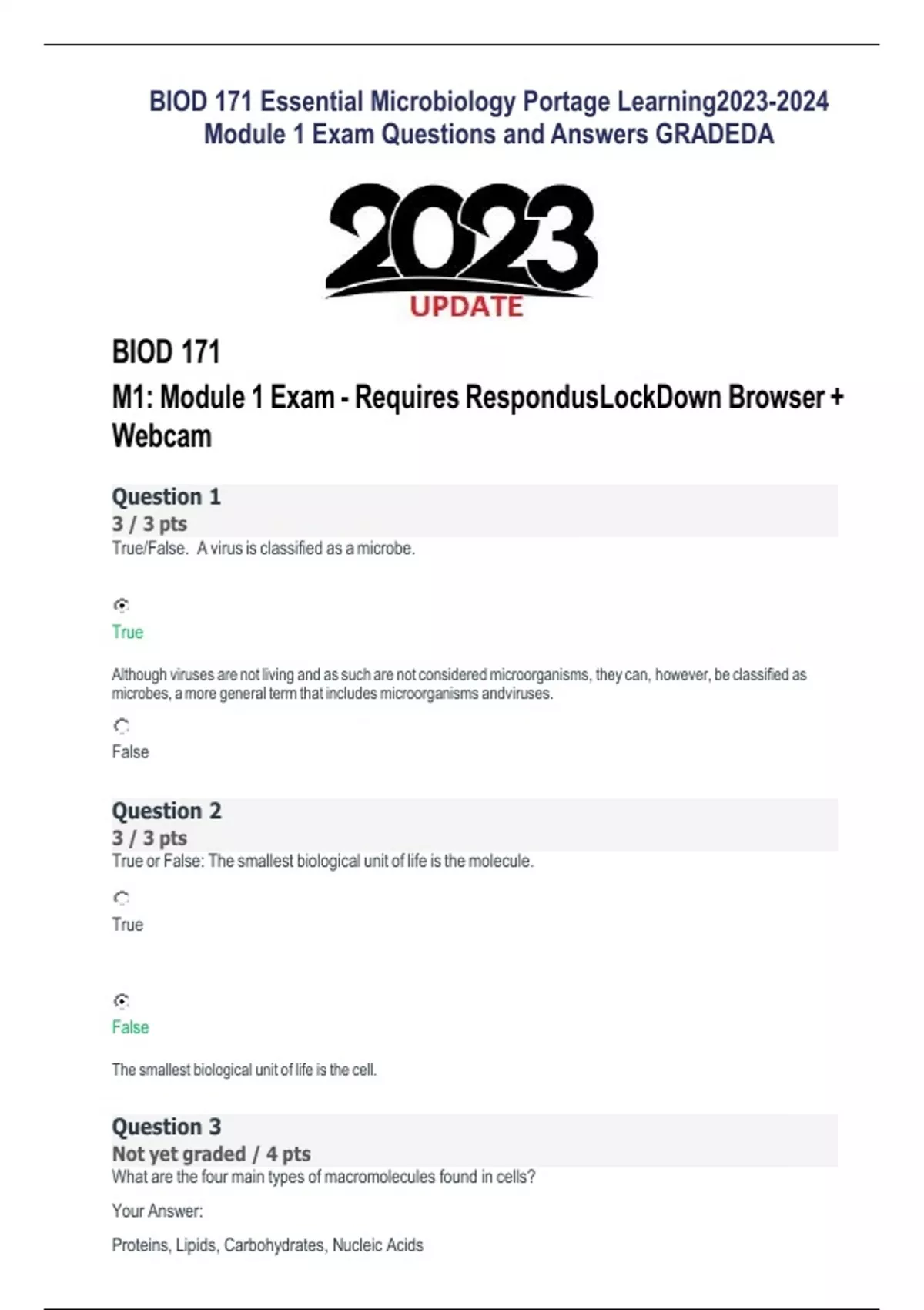 BIOD 171 Essential Microbiology Portage Learning Module 1 Exam Questions and Answers GRADEDA BIOD 171 M1: Module 1 Exam - Requires RespondusLockDown Browser + Webcam True/False. A virus is classified as amicrobe. True Although viruses are not living and as such are not consideredmicroorganisms, they can, however, be classified as microbes, amore general termthat includesmicroorganisms andviruses. False True or False: The smallest biological unit of life is the molecule. True False The smallest biological unit of life is the cell. What are the four main types of macromolecules found in cells? Your Answer: Proteins, Lipids, Carbohydrates, Nucleic Acids Question 4 Not yet graded / 3 pts Question 5 Not yet graded / 4 pts Question 6 Not yet graded / 10 pts Question 7 Not yet graded / 10 pts Proteins, Lipids, Nucleic Acids, Carbohydrates How many different types of amino acids are available from which to make proteins? Your Answer:20 20 Howmany amino acids are classified as being essential amino acids? Your Answer:9 9 Where can the two major types of nucleic acids be found in the cell, and what are theirroles? Your Answer: DNA (deoxyribonucleic acid) has the hereditary information and is responsible for the inheritied characteristics in all organisms. RNA (ribonucleic acid) is responsible for deciphering the inheritied information and using it to synthesize protein. DNA is foundin the nucleus, mitochondria, and chloroplast. RNA is found in the nucleus, cytoplasm,and ribosomes. While both DNA and RNA can be found in the nucleus (center of the cell), only RNA iscapable of leaving the nucleus. DNA contains a vast amount of hereditary information and is responsible for the inheritable characteristics of living organisms. RNA is responsible for deciphering the hereditary information in DNA and using it to synthesize proteins. Question 8 5 / 5 pts Question 9 Not yet graded / 5 pts Complete the following RNA strand, and indicate how many bonds are formed for eachcomplementary pair: 3’ GGUCAUCG 5’ 5’ CC AGC 3’ Your Answer: 3' GGUCAUCG 5' 5' CCAGUAGC 3' adesine and uracil form 2 bonds guanine and cytosine form 3 bonds3’ GGUCAUCG 5’ 5’ CCAGUAGC 3’ There are 2 bonds formed between A and U, and 3 bonds between G and C. The plasma membrane (select all that are true): Only restricts movement of materials into the cell Is often a bilayer comprised of lipids Cannot prevent essential nutrients from escaping Contains hydrophobic tails pointing inward Carbon, hydrogen, and oxygen atoms come together to form what primarymacromolecule? Give an example.
