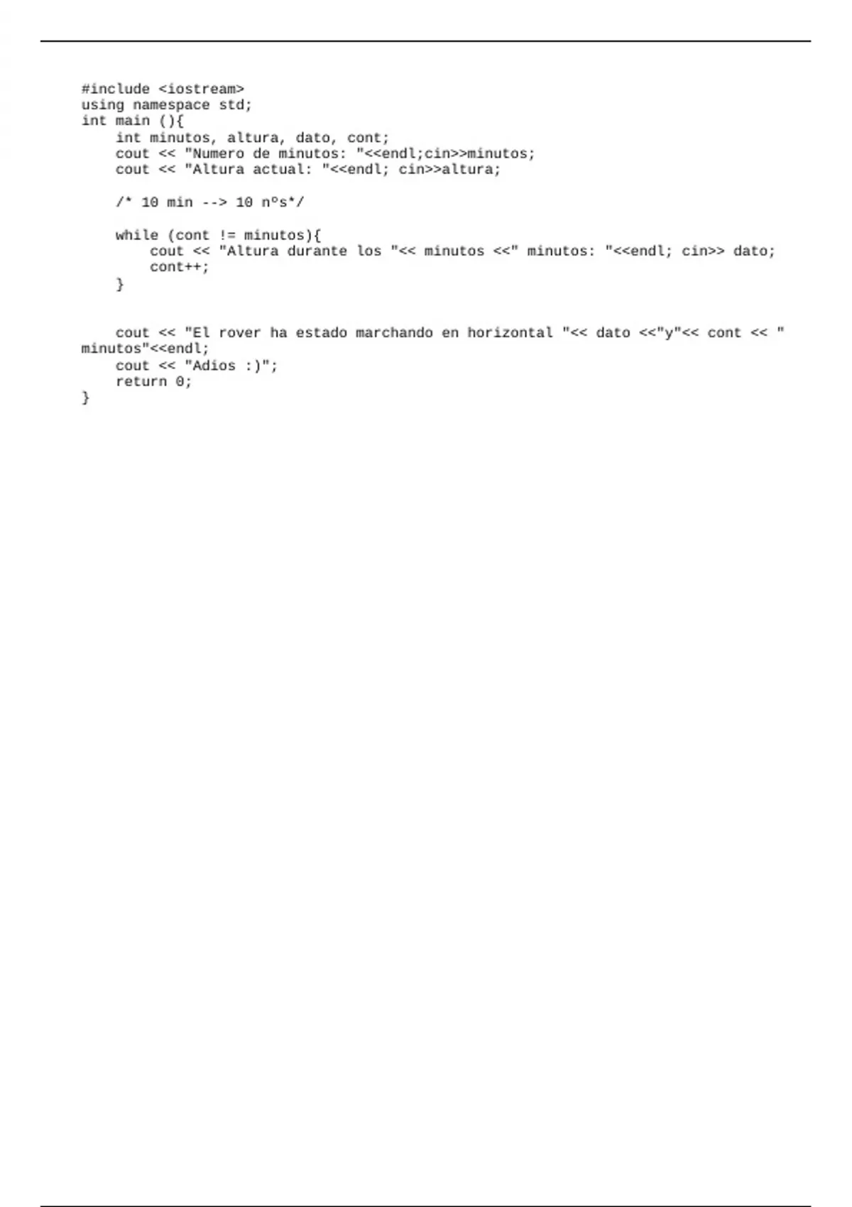 cout << "Altura durante los "<< minutos <<" minutos: "<<endl; cin>> dato;
