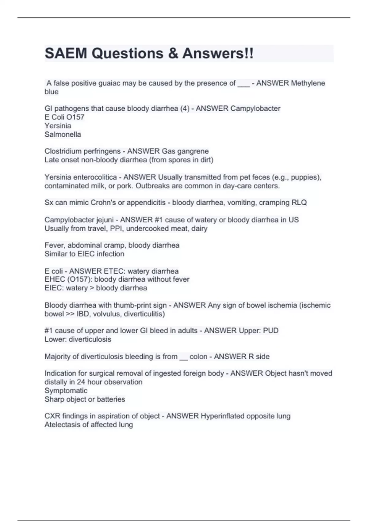 A false positive guaiac may be caused by the presence of ___ - ANSWER Methylene blue GI pathogens that cause bloody diarrhea (4) - ANSWER Campylobacter E Coli O157 Yersinia Salmonella Clostridium perfringens - ANSWER Gas gangrene Late onset non-bloody diarrhea (from spores in dirt) Yersinia enterocolitica - ANSWER Usually transmitted from pet feces (e.g., puppies), contaminated milk, or pork. Outbreaks are common in day-care centers. Sx can mimic Crohn's or appendicitis - bloody diarrhea, vomiting, cramping RLQ Campylobacter jejuni - ANSWER #1 cause of watery or bloody diarrhea in US Usually from travel, PPI, undercooked meat, dairy Fever, abdominal cramp, bloody diarrhea Similar to EIEC infection E coli - ANSWER ETEC: watery diarrhea EHEC (O157): bloody diarrhea without fever EIEC: watery bloody diarrhea Bloody diarrhea with thumb-print sign - ANSWER Any sign of bowel ischemia (ischemic bowel IBD, volvulus, diverticulitis) #1 cause of upper and lower GI bleed in adults - ANSWER Upper: PUD Lower: diverticulosis Majority of diverticulosis bleeding is from __ colon - ANSWER R side Indication for surgical removal of ingested foreign body - ANSWER Object hasn't moved distally in 24 hour observation Symptomatic Sharp object or batteries CXR findings in aspiration of object - ANSWER Hyperinflated opposite lung Atelectasis of affected lung A 22 year old running back is struck fr