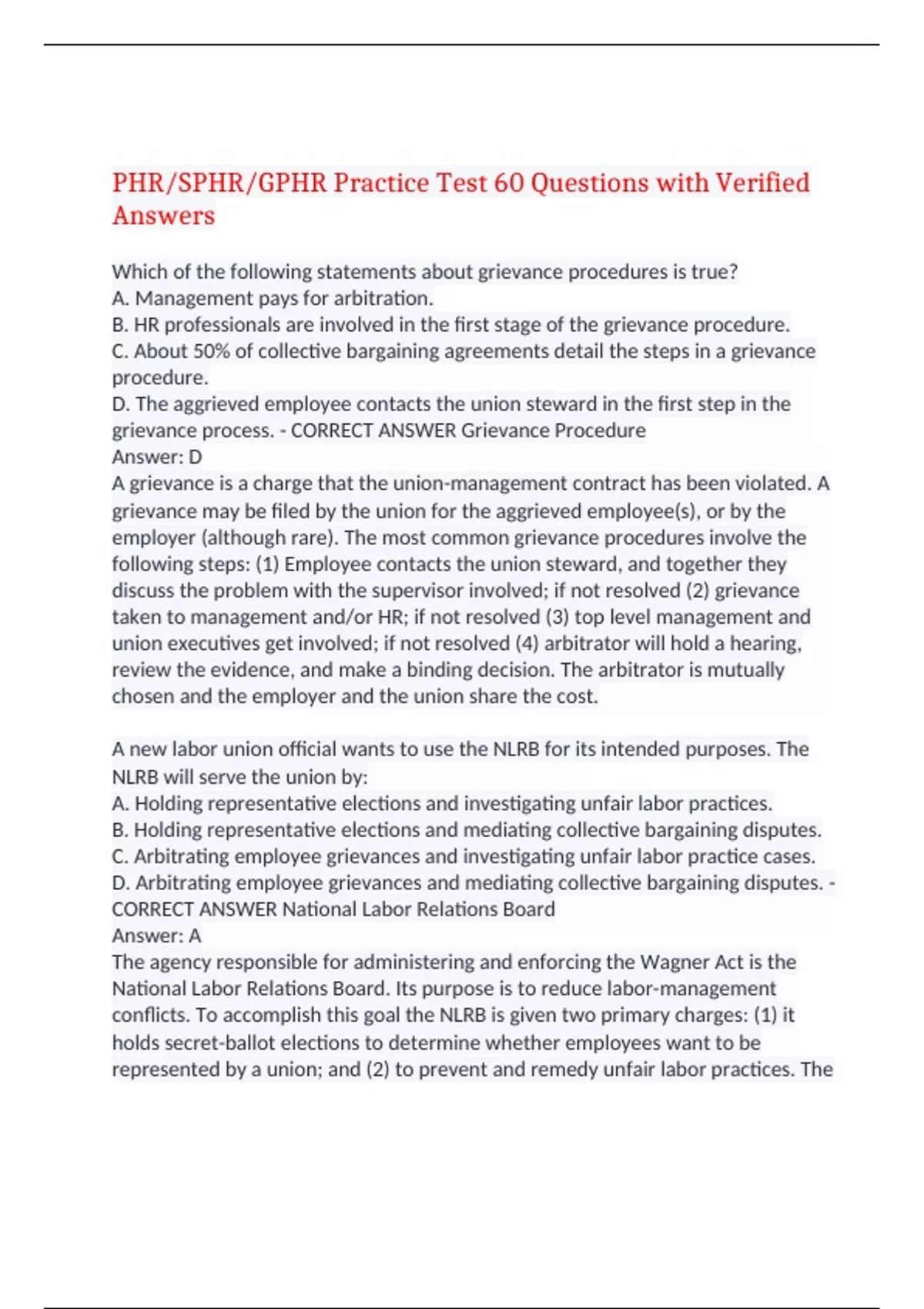 PHR/SPHR/GPHR Practice Test 60 Questions with Verified Answers Which of the following statements about grievance procedures is true? A. Management pays for arbitration. B. HR professionals are involved in the first stage of the grievance procedure. C. About 50% of collective bargaining agreements detail the steps in a grievance procedure. D. The aggrieved employee contacts the union steward in the first step in the grievance process. - CORRECT ANSWER Grievance Procedure Answer: D A grievance is a charge that the union-management contract has been violated. A grievance may be filed by the union for the aggrieved employee(s), or by the employer (although rare). The most common grievance procedures involve the following steps: (1) Employee contacts the union steward, and together they discuss the problem with the supervisor involved; if not resolved (2) grievance taken to management and/or HR; if not resolved (3) top level management and union executives get involved; if not resolved (4) arbitrator will hold a hearing, review the evidence, and make a binding decision. The arbitrator is mutually chosen and the employer and the union share the cost. A new labor union official wants to use the NLRB for its intended purposes. The NLRB will serve the union by: A. Holding representative elections and investigating unfair labor practices. B. Holding representative elections and mediating collective bargaining disputes. C. Arbitrating employee grievances and investigating unfair labor practice cases. D. Arbitrating employee grievances and mediating collective bargaining disputes. - CORRECT ANSWER National Labor Relations Board Answer: A The agency responsible for administering and enforcing the Wagner Act is the National Labor Relations Board. Its purpose is to reduce labor-management conflicts. To accomplish this goal the NLRB is given two primary charges: (1) it holds secret-ballot elections to determine whether employees want to be represented by a union; and (2) to prevent and remedy unfair labor practices. The NLRB has regional offices and smaller field offices that process charges of unfair labor practices and petitions for employee elections. An ADR process used to address grievances that is considered "win-win" is: A. Litigation B. Arbitration C. Mediation D. Peer Review - CORRECT ANSWER Alternative Dispute Resolution (ADR) Answer: C Alternative dispute resolution (ADR) is an attempt to settle an employee grievance without going through the legal process (answer a - litigation). Mediation (answer c) is where a neutral 3rd party assists in resolving a grievance between parties. It results in a win-win solution (both parties negotiate to a mutually-satisfactory resolution of the grievance). Answer (b) arbitration occurs when a neutral 3rd party makes binding decision. It results in a decision where one party wins all and the other loses. Answer (d) peer review panels are groups of co-workers who review management's disciplinary decisions and make recommendations or, at times, even the final decision. It is also a win-lose resolution. Union organizing campaigns begin when any of the following occur, except: A. Employees request the union organizing campaign B. Employer is targeted by the union C. Union files a petition with the NLRB for recognition D. Employer requests the union campaign - CORRECT ANSWER Union Organizing Campaign Answer: C The union files a petition with the NLRB when it has a minimum of 30% signed authorization cards from employees authorizing the union as their collective bargaining agent. Unions begin an organizing campaign when employees seek union representation, the employer is targeted by the union, or the employer requests the union campaign because it knows it will be targeted by a union soon and it wants a specific union representing its workers. What is the purpose of workers' compensation legislation? A. To protect workers from unsafe working conditions B. To give workers paid time off when ill or injured C. To make employers liable for work related injuries D. To cover income and medical costs for work related injuries. - CORRECT ANSWER Workers' Compensation Answer: D State workers' compensation laws vary, but all are intended to provide for payment of full medical expenses, partial lost wages (usually 2/3 of salary), and survivor benefits, for work related injuries. Answer (a) is wrong - OSHA's purpose is to protect workers from unsafe working conditions; (b) it must be a work-related illness or injury to be covered under workers' compensation; (c) Workers' Compensation is no-fault insurance. The employer is not "liable". What is the BEST answer? The use of information technology impacts HR by: A. Facilitating more efficient communication between departments. B. Keeping better records. C. Expanding the scope and function of HR. D. Protecting the confidentiality of employee information. - CORRECT ANSWER HRIS Answer: C Although all of the answers are somewhat correct, answer (c) is the overall best reason for the impact on HR today. Human Resource Information Systems (HRIS) have allowed HR to become more strategic and less administrative. Employers paying men more than women performing the same job are in violation of the Equal Pay Act, if the pay difference is based on: A. Seniority systems B. Merit pay plans C. Incentive payments D. Similar conditions - CORRECT ANSWER Equal Pay Act Answer: D The Equal Pay Act prohibits discrimination in pay, employee benefits, and pensions based on gender for employees doing equal work. Equal work is defined as jobs that require substantially the same skill, effort, and responsibility under similar working conditions and in the same location. Employers do not violate the provisions of the EPA when they base wage differences on anything other than gender such as seniority, merit, or incentive pay plans. The Equal Pay Act is an amendment to the Civil Rights Act, Title VII and is administered by the Equal Employment Opportunity Comm
