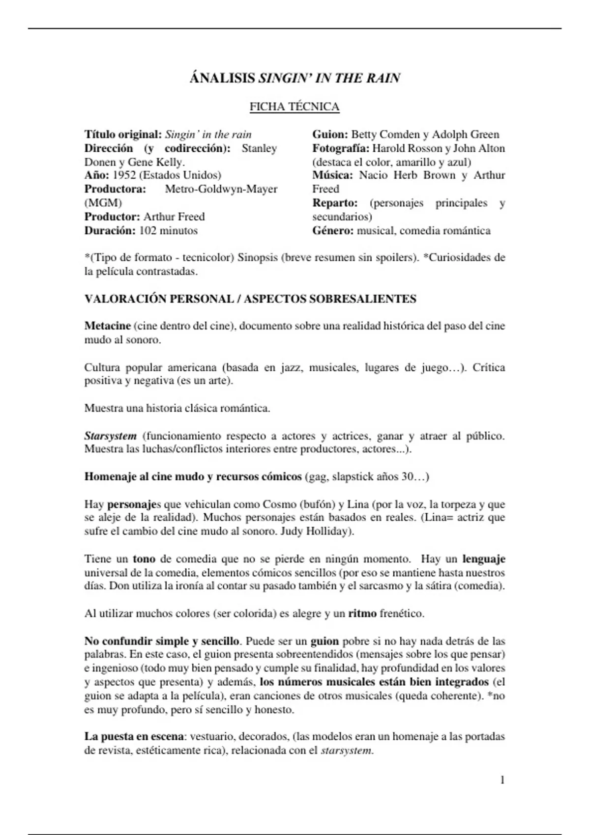 Análisis guiado de la película musical Singin' in the rain (Bailando bajo la lluvia) de 1952 dirigida por Gene Kelly y Stanley Donen. Incluye el paso a paso con los elementos a incluir para hacer un buen análisis de una película, así como la ficha técnica.