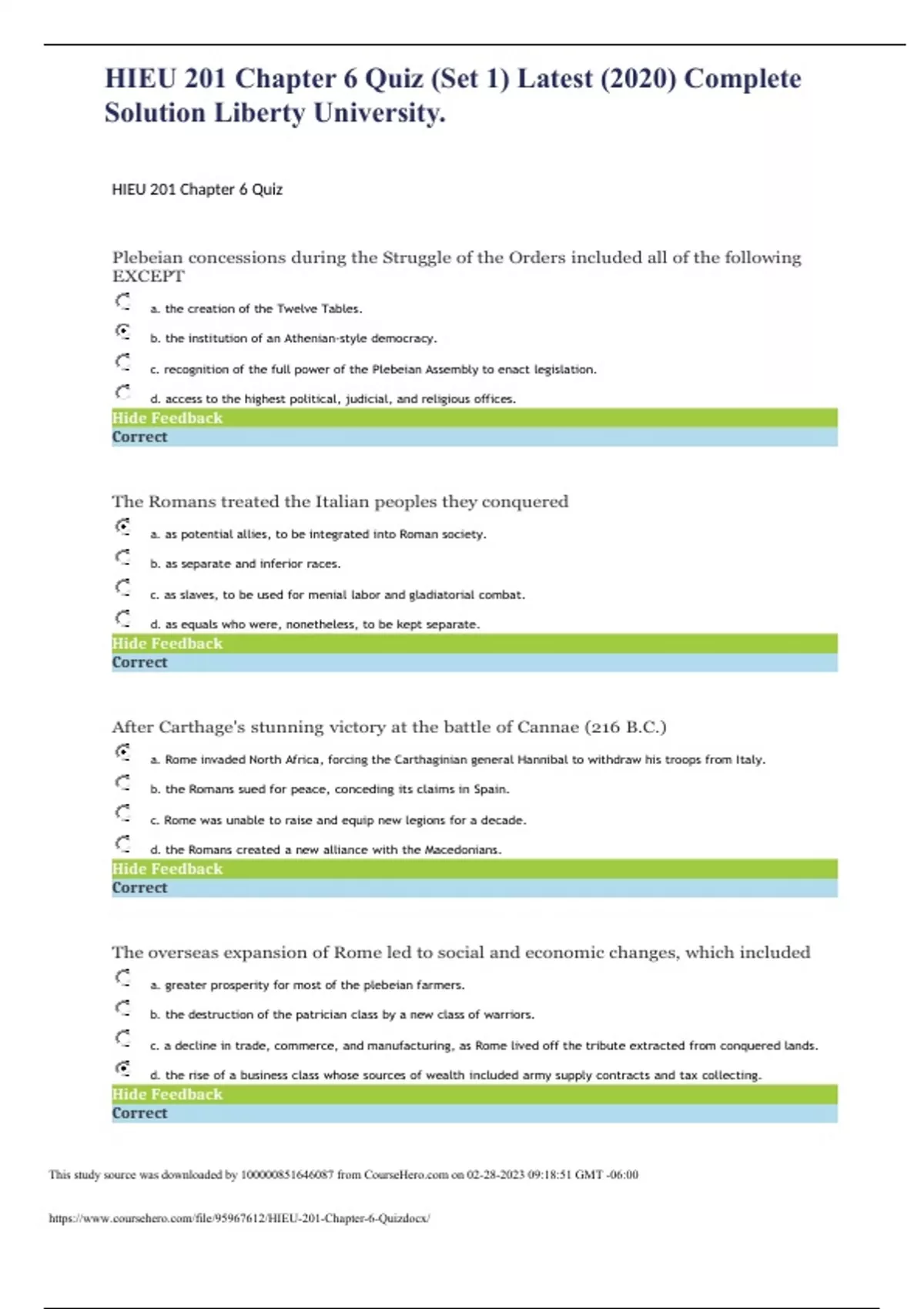 HIEU 201 Chapter 6 Quiz (Set 1) Latest (2020) Complete Solution Liberty University. HIEU 201 Chapter 6 Quiz Plebeian concessions during the Struggle of the Orders included all of the following EXCEPT a. the creation of the Twelve Tables. b. the institution of an Athenian-style democracy. c. recognition of the full power of the Plebeian Assembly to enact legislation. d. access to the highest political, judicial, and religious offices. The Romans treated the Italian peoples they conquered a. as potential allies, to be integrated into Roman society. b. as separate and inferior races. c. as slaves, to be used for menial labor and gladiatorial combat. d. as equals who were, nonetheless, to be kept separate. After Carthage's stunning victory at the battle of Cannae (216 B.C.) a. Rome invaded North Africa, forcing the Carthaginian general Hannibal to withdraw his troops from Italy. b. the Romans sued for peace, conceding its claims in Spain. c. Rome was unable to raise and equip new legions for a decade. d. the Romans created a new alliance with the Macedonians. The overseas expansion of Rome led to social and economic changes, which included a. greater prosperity for most of the plebeian farmers. b. the destruction of the patrician class by a new class of warriors. c. a decline in trade, commerce, and manufacturing, as Rome lived off the tribute extracted from conquered lands. d. the rise of a business class whose sources of wealth included army supply contracts and tax collecting.