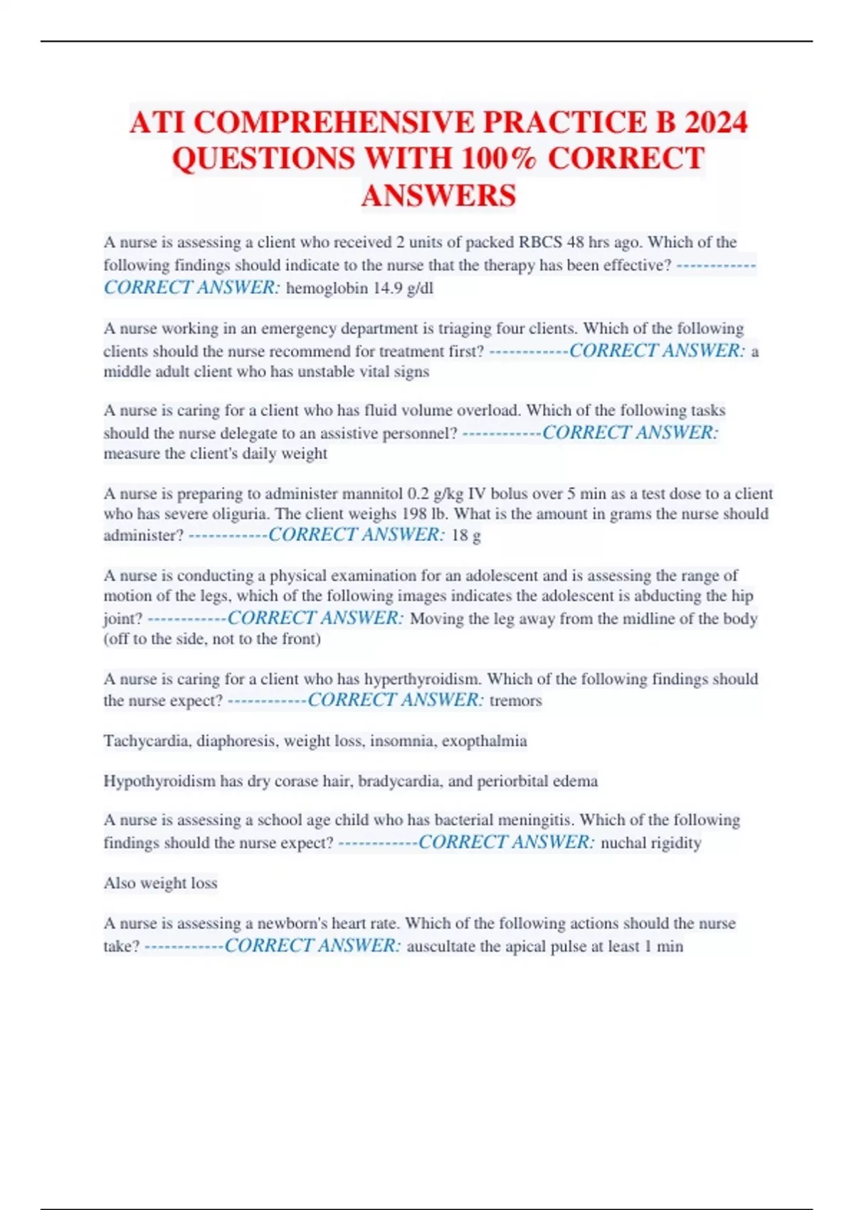 ATI COMPREHENSIVE PRACTICE B 2024 QUESTIONS WITH 100% CORRECT ANSWERS