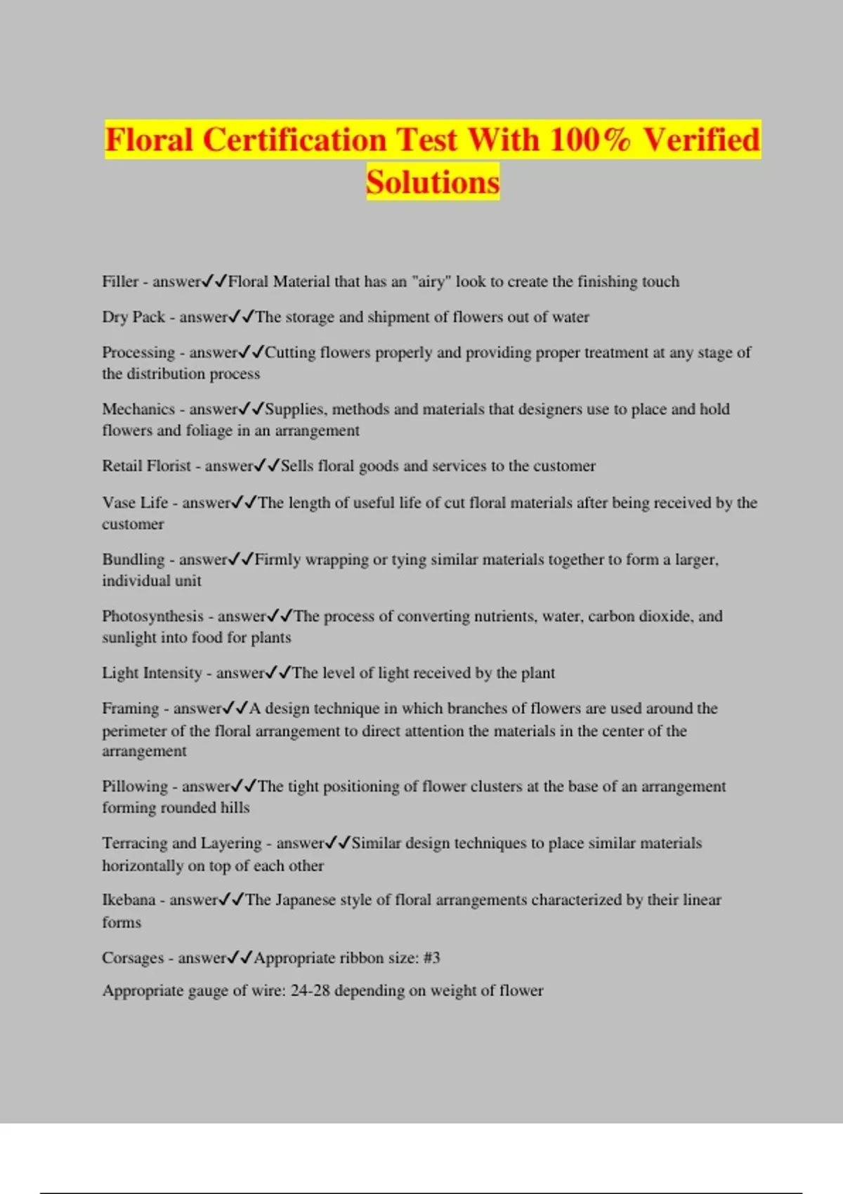 Floral Certification Test With 100% Verified Solutions Filler - answerFloral Material that has an "airy" look to create the finishing touch Dry Pack - answerThe storage and shipment of flowers out of water Processing - answerCutting flowers properly and providing proper treatment at any stage of the distribution process Mechanics - answerSupplies, methods and materials that designers use to place and hold flowers and foliage in an arrangement Retail Florist - answerSells floral goods and services to the customer Vase Life - answerThe length of useful life of cut floral materials after being received by the customer Bundling - answerFirmly wrapping or tying similar materials together to form a larger, individual unit Photosynthesis - answerThe process of converting nutrients, water, carbon dioxide, and sunlight into food for plants Light Intensity - answerThe level of light received by the plant Framing - answerA design technique in which branches of flowers are used around the perimeter of the floral arrangement to direct attention the materials in the center of the arrangement Pillowing - answerThe tight positioning of flower clusters at the base of an arrangement forming rounded hills Terracing and Layering - answerSimilar design techniques to place similar materials horizontally on top of each other Ikebana - answerThe Japanese style of floral arrangements characterized by their linear forms Corsages - answerAppropriate ribbon size: #3 Appropriate gauge of wire: 24-28 depending on weight of flow