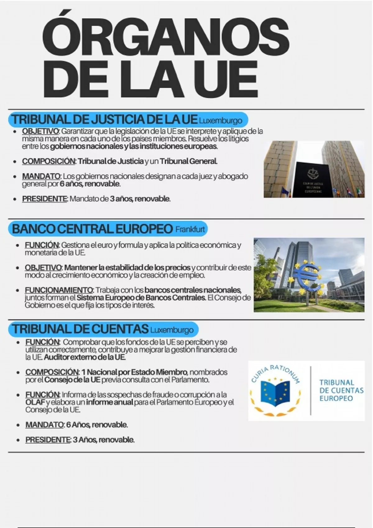 Resumen perfecto para estudiar los órganos de la UE, tales como el Parlamento Europeo, Consejo Europeo, Consejo de la UE, Comisión Europea, Tribunal de Cuentas, Tribunal de Justicia de la UE, Banco Central Europeo, Comité Económico y Social, Comité de las Regiones, Banco Europeo de Inversiones, Fondo Europeo de Inversiones, OMBUDSMAN, Supervisor de Protección de Datos y Comité de Protección de Datos.