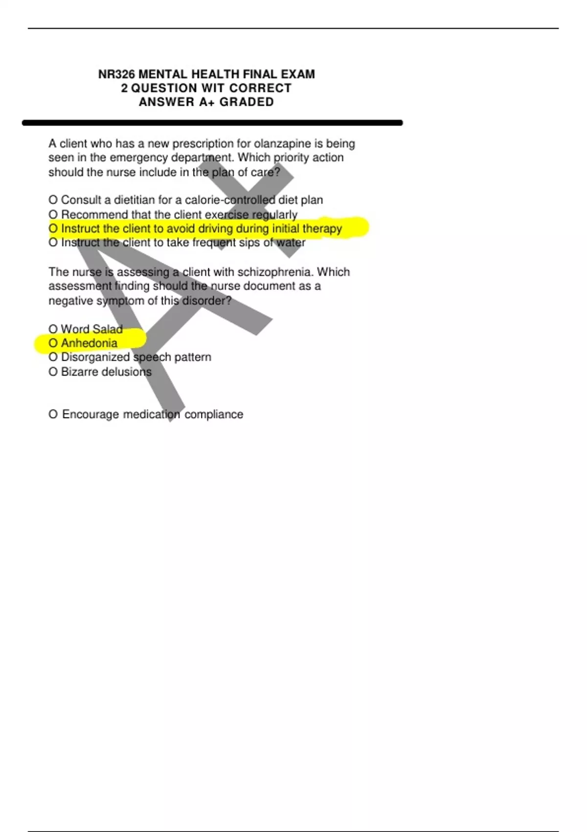 NR326 MENTAL HEALTH FINAL EXAM 2 QUESTION WIT CORRECT ANSWER A+ GRADED A client who has a new prescription for olanzapine is being seen in the emergency department. Which priority action should the nurse include in the plan of care?