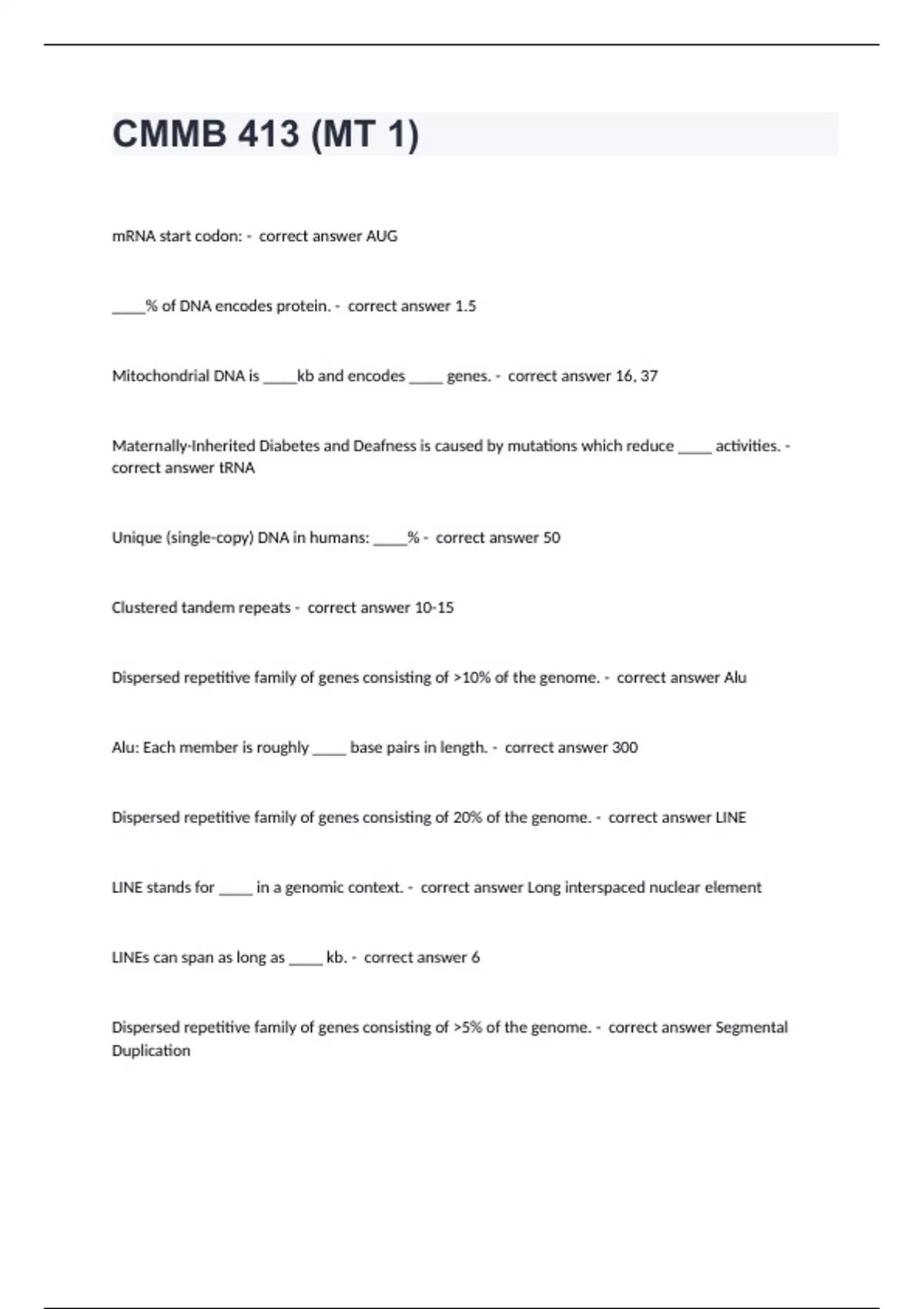 CMMB 413 (MT 1)mRNA start codon: - correct answer AUG ____% of DNA encodes protein. - correct answer 1.5 Mitochondrial DNA is ____kb and encodes ____ genes. - correct answer 16, 37 Maternally-Inherited Diabetes and Deafness is caused by mutations which reduce ____ activities. - correct answer tRNA Unique (single-copy) DNA in humans: ____% - correct answer 50 Clustered tandem repeats - correct answer 10-15 Dispersed repetitive family of genes consisting of >10% of the genome. - correct answer Alu Alu: Each member is roughly ____ base pairs in length. - correct answer 300 Dispersed repetitive family of genes consisting of 20% of the genome. - correct answer LINE LINE stands for ____ in a genomic context. - correct answer Long interspaced nuclear element LINEs can span as long as ____ kb. - correct answer 6 Dispersed repetitive family of genes consisting of >5% of the genome. - correct answer Segmental Duplication