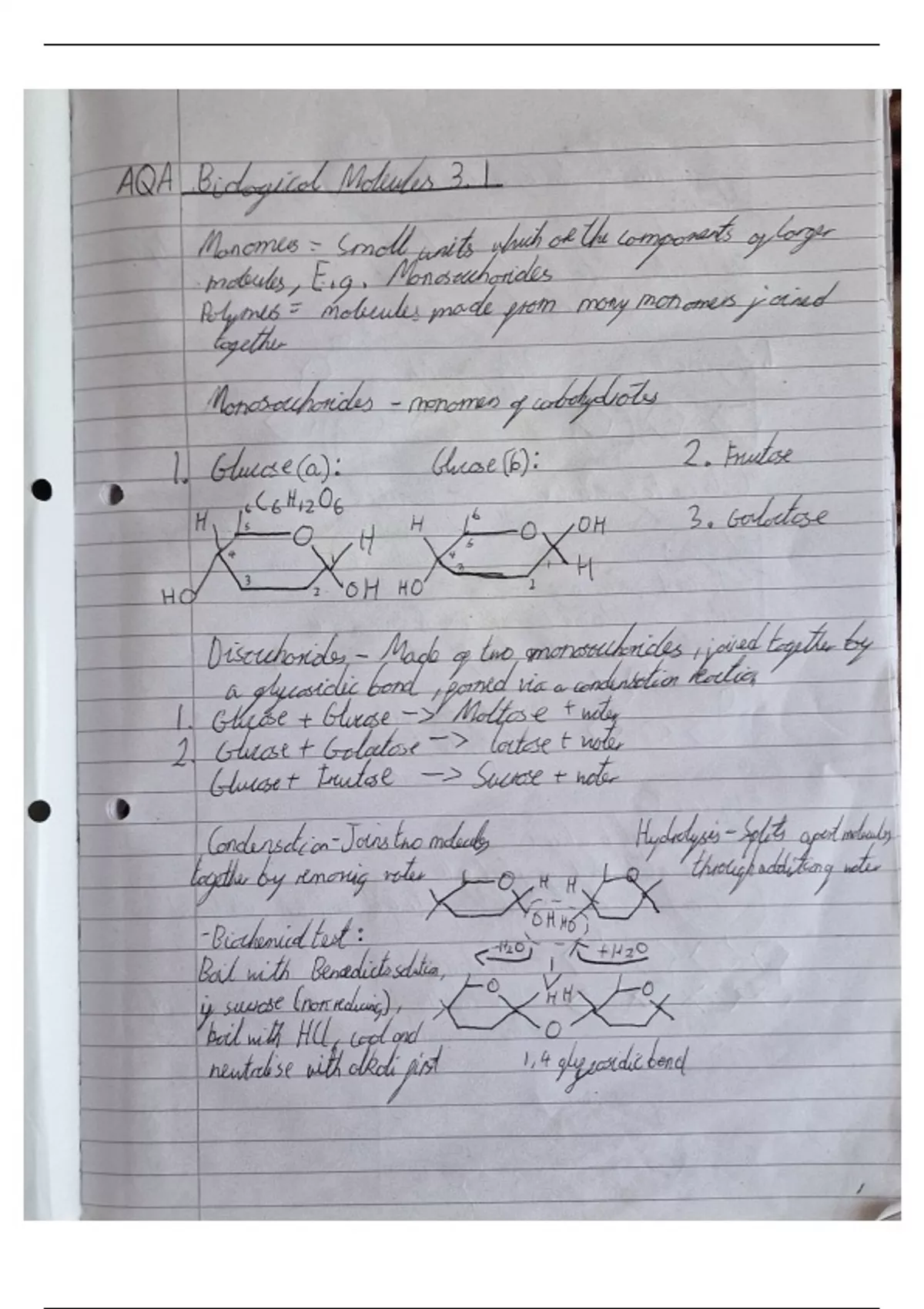A level Biology Topic 1 - Biological Molecules - Personal Class Notes