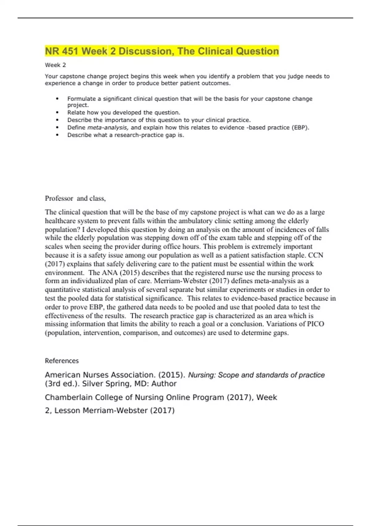 NR 451 Week 2 Discussion, The Clinical Question Week 2 Your capstone change project begins this week when you identify a problem that you judge needs to experience a change in order to produce better patient outcomes. • Formulate a significant clinical question that will be the basis for your capstone change project. • Relate how you developed the question. • Describe the importance of this question to your clinical practice. • Define meta-analysis, and explain how this relates to evidence -based practice (EBP). • Describe what a research-practice gap is. Professor and class, The clinical question that will be the base of my capstone project is what can we do as a large healthcare system to prevent falls within the ambulatory clinic setting among the elderly population? I developed this question by doing an analysis on the amount of incidences of falls while the elderly population was stepping down off of the exam table and stepping off of the scales when seeing the provider during office hours. This problem is extremely important because it is a safety issue among our population as well as a patient satisfaction staple. CCN (2017) explains that safely delivering care to the patient must be essential within the work environment. The ANA (2015) describes that the registered nurse use the nursing process to form an individualized plan of care. Merriam-Webster (2017) defines meta-analysis as a quantitative statistical analysis of several separate but similar experiments or studies in order to test the pooled data for statistical significance. This relates to evidence-based practice because in order to prove EBP, the gathered data needs to be pooled and use that pooled data to test the effectiveness of the results. The research practice gap is characterized as an area which is missing information that limits the ability to reach a goal or a conclusion. Variations of PICO (population, intervention, comparison, and outcomes) are used to determine gaps. References American Nurses Association. (2015). Nursing: Scope and standards of practice (3rd ed.). Silver Spring, MD: Author Chamberlain College of Nursing Online Program (2017), Week 2, Lesson Merriam-Webster (2017)