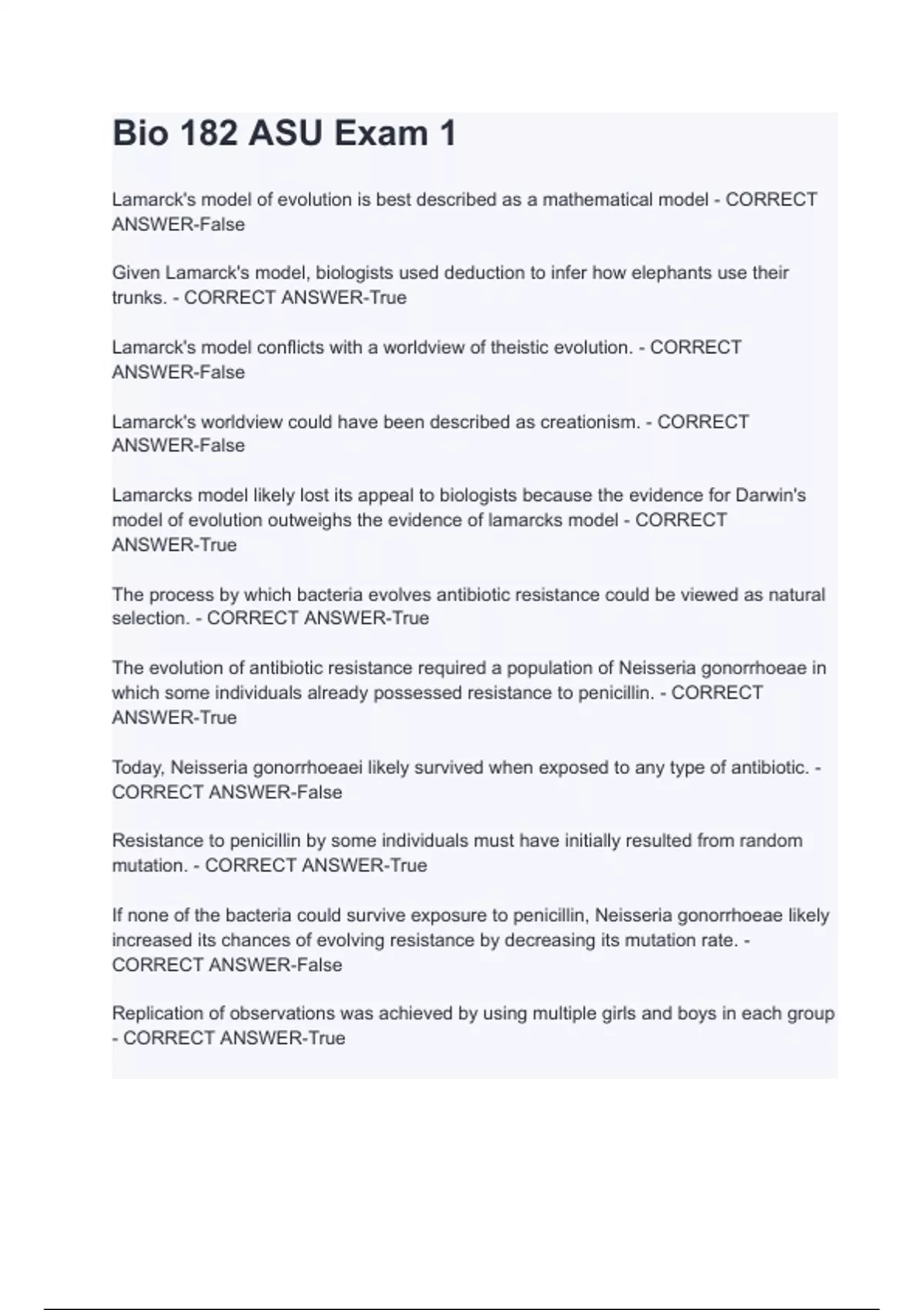 Bio 182 ASU Exam 1 Lamarck's model of evolution is best described as a mathematical model - CORRECT ANSWER-False Given Lamarck's model, biologists used deduction to infer how elephants use their trunks. - CORRECT ANSWER-True Lamarck's model conflicts with a worldview of theistic evolution. - CORRECT ANSWER-False Lamarck's worldview could have been described as creationism. - CORRECT ANSWER-False Lamarcks model likely lost its appeal to biologists because the evidence for Darwin's model of evolution outweighs the evidence of lamarcks model - CORRECT ANSWER-True The process by which bacteria evolves antibiotic resistance could be viewed as natural selection. - CORRECT ANSWER-True The evolution of antibiotic resistance required a population of Neisseria gonorrhoeae in which some individuals already possessed resistance to penicillin. - CORRECT ANSWER-True Today, Neisseria gonorrhoeaei likely survived when exposed to any type of antibiotic. - CORRECT ANSWER-False Resistance to penicillin by some individuals must have initially resulted from random mutation. - CORRECT ANSWER-True If none of the b