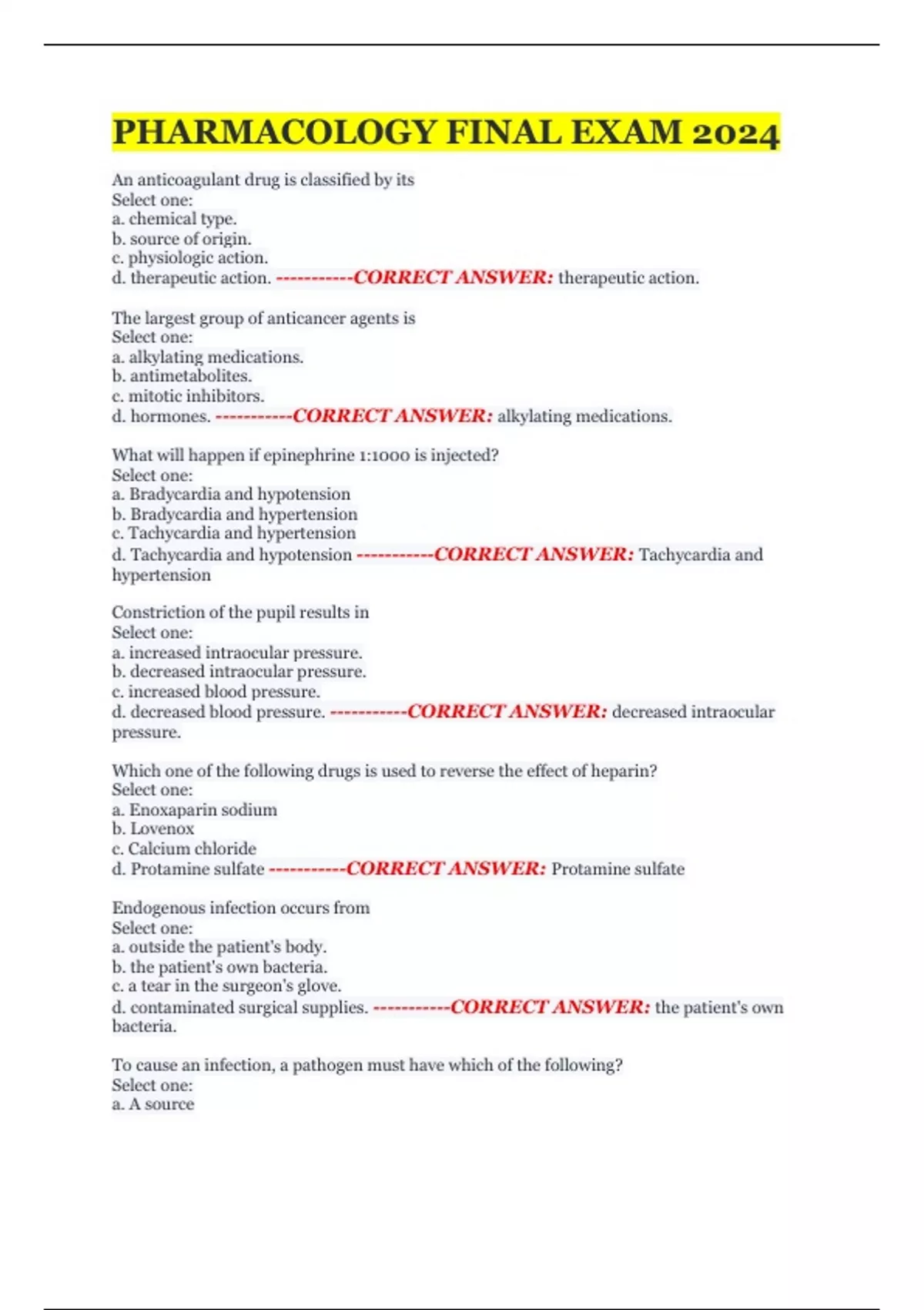 PHARMACOLOGY FINAL EXAM 2024 An anticoagulant drug is classified by its Select one: a. chemical type. b. source of origin. c. physiologic action. d. therapeutic action. The largest group of anticancer agents is Select one: a. alkylating medications. b. antimetabolites. c. mitotic inhibitors. d. hormones. What will happen if epinephrine 1:1000 is injected? Select one: a. Bradycardia and hypotension b. Bradycardia and hypertension c. Tachycardia and hypertension d. Tachycardia and hypotension