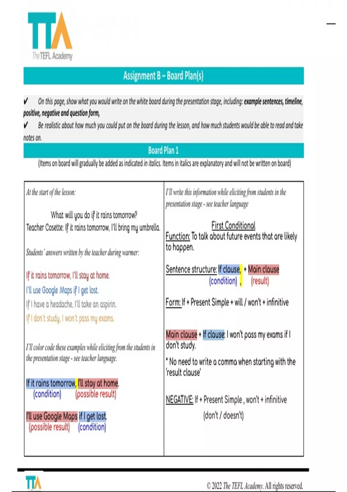 ✔ On this page, show what you would write on the white board during the presentation stage, including: example sentences, timeline,