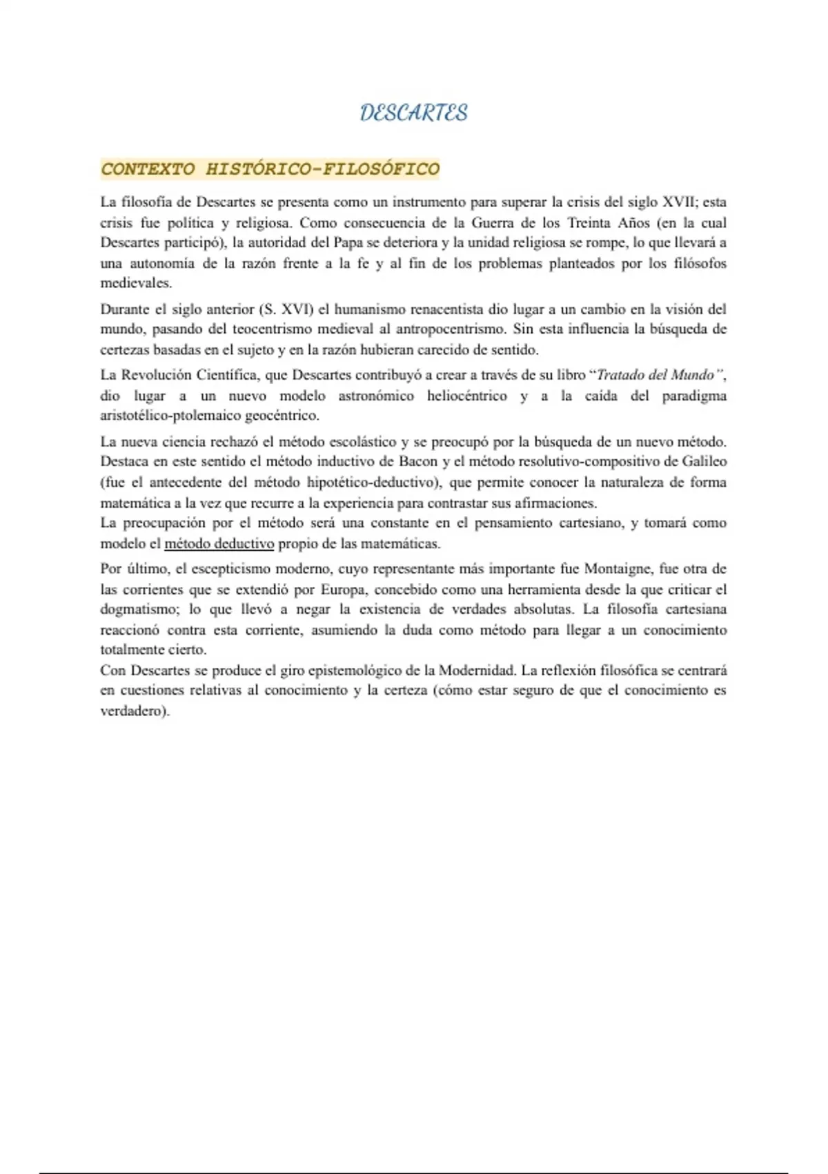 Con Descartes se produce el giro epistemológico de la Modernidad. La reflexión filosófica se centrará