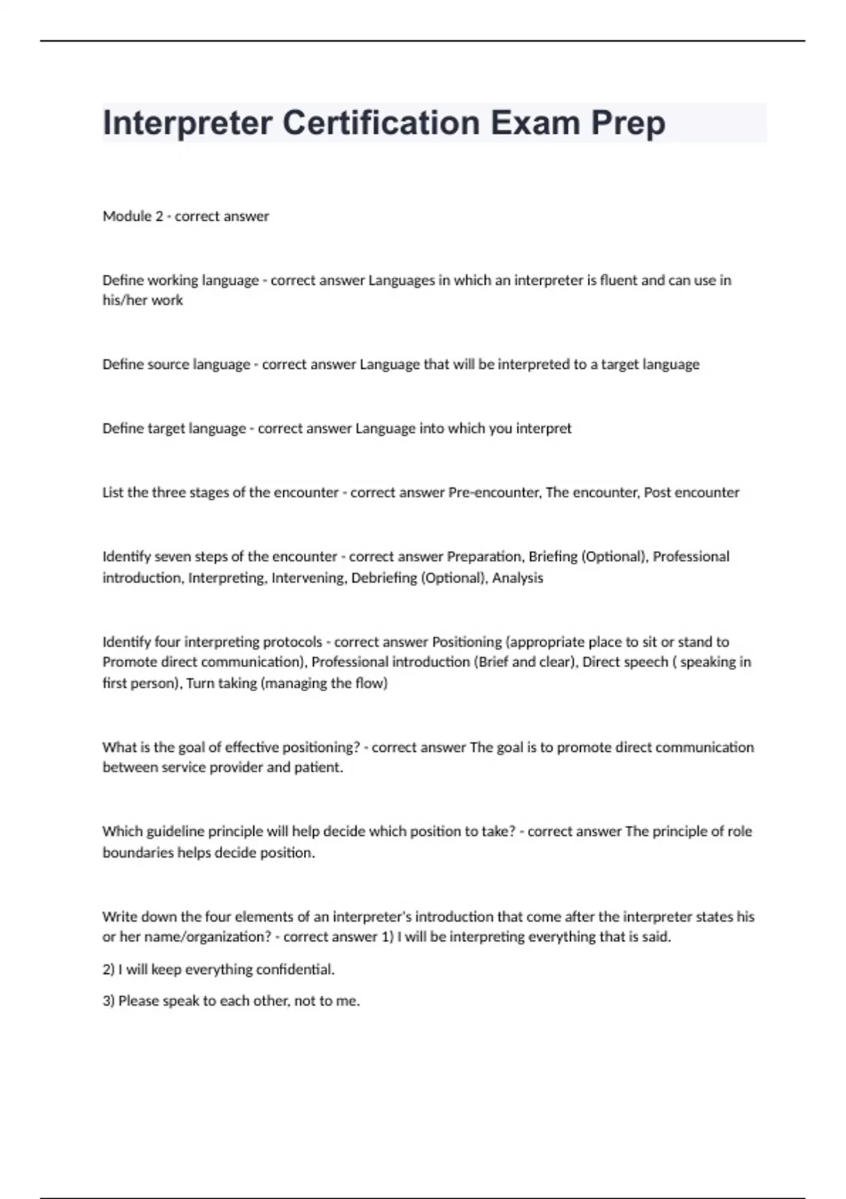 Interpreter Certification Exam PrepModule 2 - correct answer Define working language - correct answer Languages in which an interpreter is fluent and can use in his/her work Define source language - correct answer Language that will be interpreted to a target language Define target language - correct answer Language into which you interpret List the three stages of the encounter - correct answer Pre-encounter, The encounter, Post encounter Identify seven steps of the encounter - correct answer Preparation, Briefing (Optional), Professional introduction, Interpreting, Intervening, Debriefing (Optional), Analysis Identify four interpreting protocols - correct answer Positioning (appropriate place to sit or stand to Promote direct communication), Professional introduction (Brief and clear), Direct speech ( speaking in first person), Turn taking (managing the flow) What is the goal of effective positioning? - correct answer The goal is to promote direct communication between service provider and patient. Which guideline principle will help decide which position to take? - correct answer The principle of role boundaries helps decide position. Write down the four elements of an interpreter's introduction that come after the interpreter states his or her name/organization? - correct answer 1) I will be interpreting everything that is said. 2) I will keep everything confidential. 3) Please speak to each other, not to me.