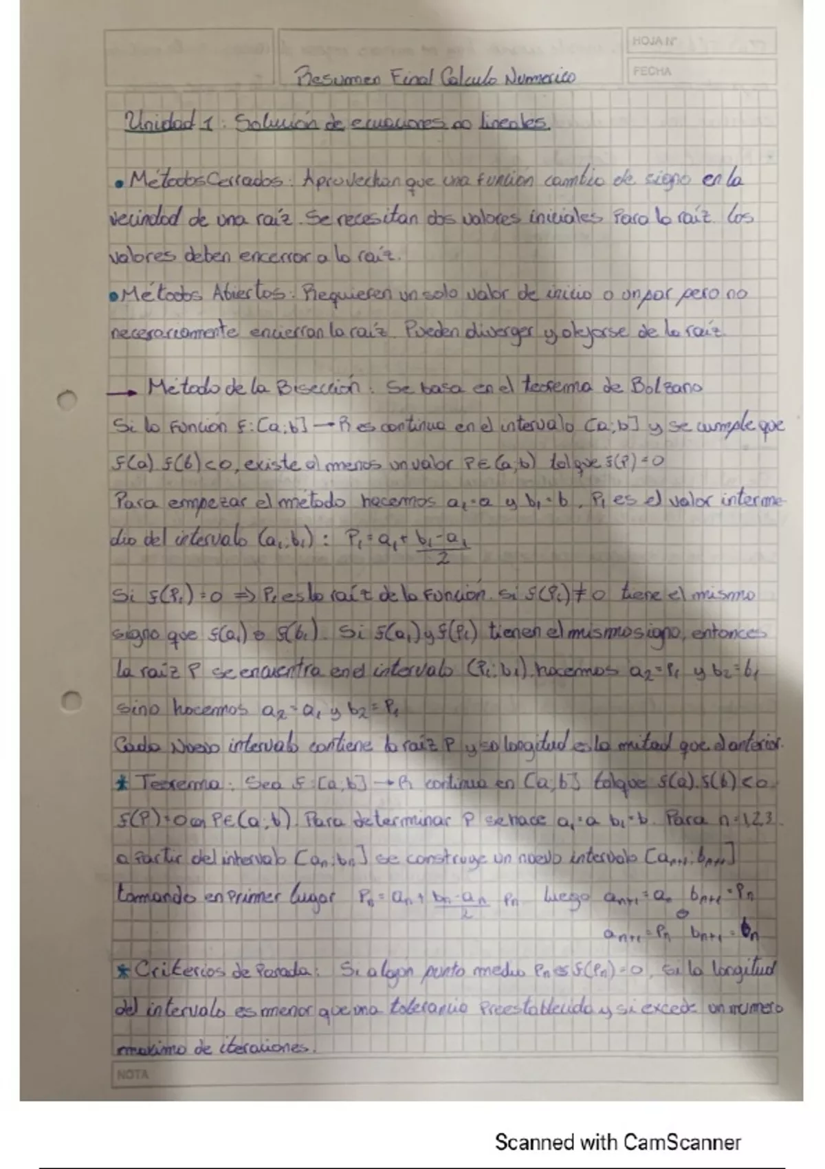 contenido del documento: resumen extraído de varios libros para la materia calculo numérico. Se desarrollan los siguientes métodos: BISECCION REGLA FALSA PUNTO FIJO NEWTON- RAPHSON NEWTON-RAPHSON MODIFICADO SECANTE HALLEY DIFERENCIAS DIVIDIDAS DE NEWTON POLINOMIOS DE LAGRANGE SPLINE CUBICO JACOBI MAXIMA DIRECCION DE DESCENSO GRADIENTE CONJUGADOS PUNTO MEDIO TRAPECIO SIMPSON 1/3 GAUSS- LEGENDRE EULER EULER MEJORADO RUNGE-KUTTA ORDEN 4