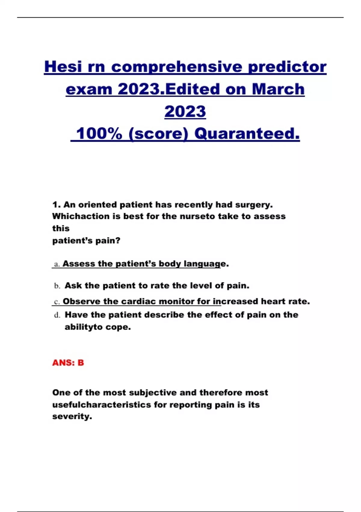 1. An oriented patient has recently had surgery. Which action is best for the nurseto take to assess this patient’s pain? a. Assess the patient’s body language. b. Ask the patient to rate the level of pain. c. Observe the cardiac monitor for increased heart rate. d. Have the patient describe the effect of pain on the ability to cope. ANS: B One of the most subjective and therefore most useful characteristics for reporting pain is its severity. Therefore, the best way to assess a patient’s painis to ask the patient to rate the pain. Nonverbal communication, such as body language, is not as effective in assessing pain, especially when the patient is oriented. Heart rate sometimes increases when a patient is in pain, but this is not a symptom that is specific to pain. Pain sometimes affects a patient’s ability to cope, but assessing the effect of pain on coping assesses the patient’sability to cope; it does not assess the patient’s pain. 2.A nurse is caring for a patient who recently had abdominal surgery and is experiencing severe pain. The patient’s blood pressure is 110/60 mm Hg, and heart rate is 60 beats/min. Additionally, the patient does not appear to be in any distress. Which response by the nurse is most therapeutic? “Your vitals do not show that you are having pain; can you describe your pain?” “OK, I will go get you some narcotic pain relievers immediately.” “What would you like to try to alleviate your pain?” “You do not look like you are in pain.”