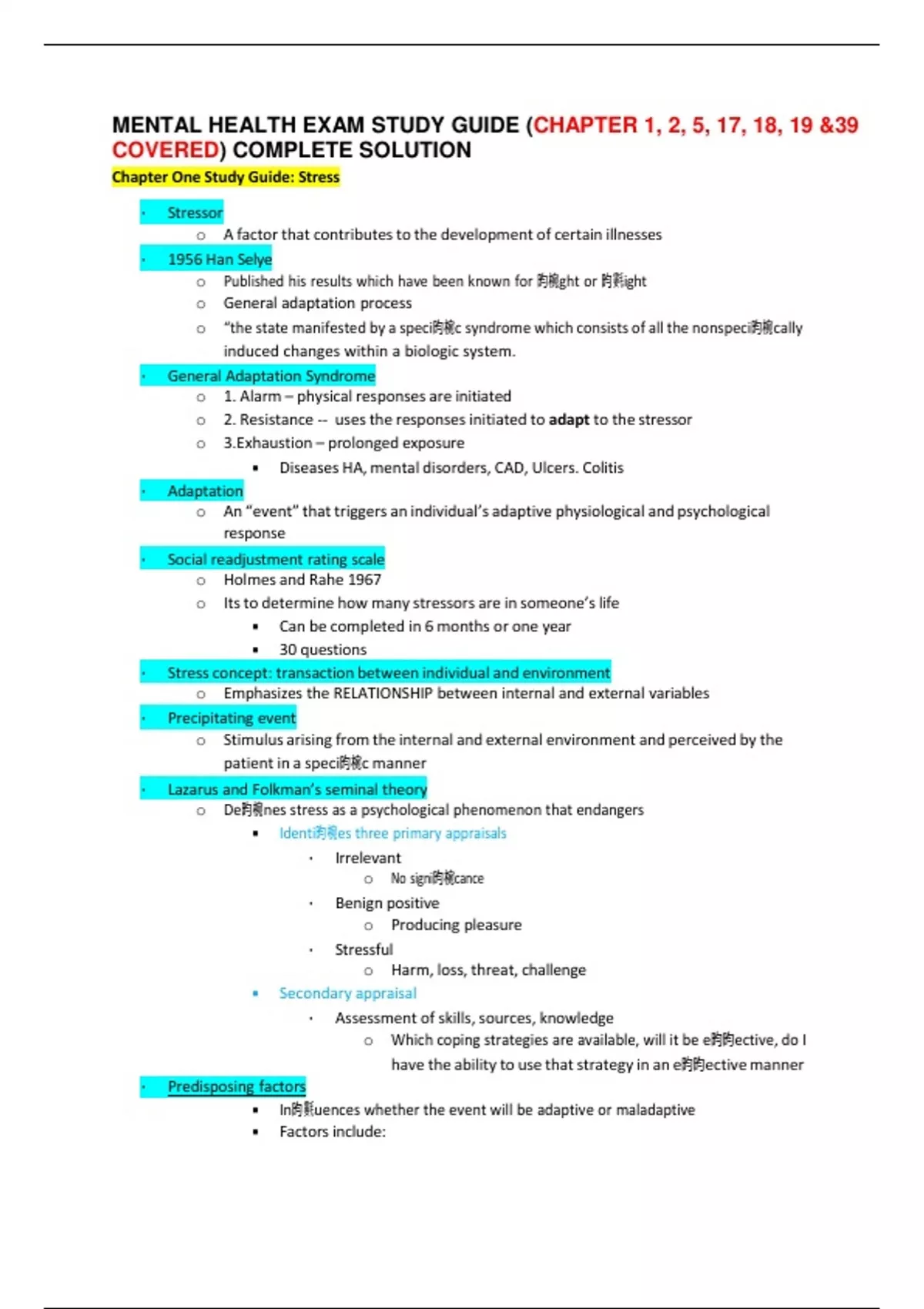 MENTAL HEALTH EXAM STUDY GUIDE (CHAPTER 1, 2, 5, 17, 18, 19 &39 COVERED) COMPLETE SOLUTION Chapter One Study Guide: Stress • Stressor o A factor that contributes to the development of certain illnesses • 1956 Han Selye o Published his results which have been known for 昀椀ght or 昀氀ig