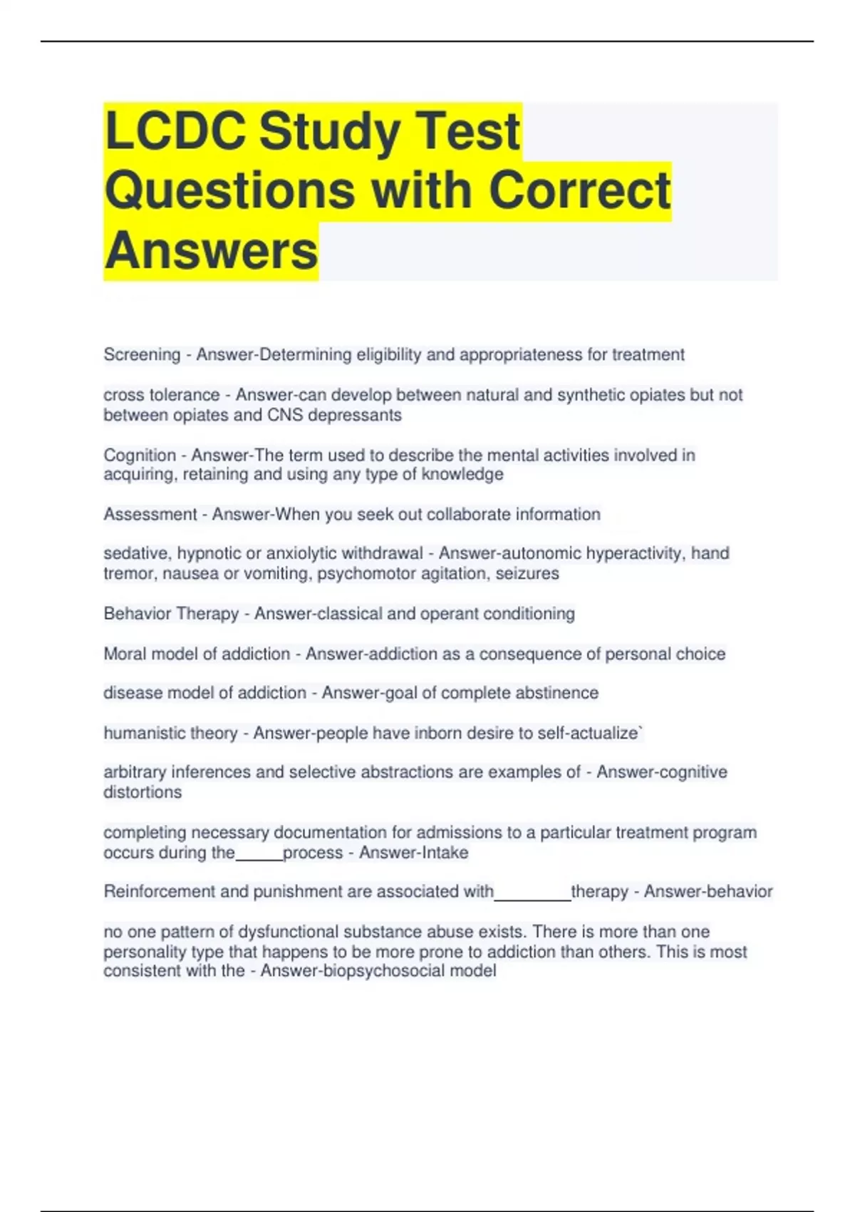 LCDC Study Test Questions with Correct Answers Screening - Answer-Determining eligibility and appropriateness for treatment cross tolerance - Answer-can develop between natural and synthetic opiates but not between opiates and CNS depressants Cognition - Answer-The term used to describe the mental activities involved in acquiring, retaining and using any type of knowledge Assessment - Answer-When you seek out collaborate information sedative, hypnotic or anxiolytic withdrawal - Answer-autonomic hyperactivity, hand tremor, nausea or vomiting, psychomotor agitation, seizures Behavior Therapy - Answer-classical and operant conditioning Moral model of addiction - Answer-addiction as a consequence of personal choice disease model of addiction - Answer-goal of complete abstinence humanistic theory - Answer-people have inborn desire to self-actualize` arbitrary inferences and selective abstractions are examples of - Answer-cognitive distortions completing necessary documentation for admissions to a particular treatment program occurs during the process - Answer-Intake Reinforcement and punishment are associated with therapy - Answer-behavior no one pattern of dysfunctional substance abuse exists. There is more than one personality type that happens to be more prone to addiction than others. This is most consistent with the - Answer-biopsychosocial model which core function of counseling is related to the term didactic - Answer-client education which neurotransmitter is most closely associated with feelings of well-being, appetite and mental alertness - Answer-serotonin CNS depressant - Answer-Xanax SSRI - Answer-Prozac, Paxil, Zoloft Relapse - Answer-The return to a pattern of substance abuse following treatment agonist - Answer-when a drug initiates a physiological response when attaching to a receptor site in the brain Cannabis withdrawal - Answer-nervousness, anxiety, sleep difficulty, depressed mood, decreased appetite or weight loss rational emotive behavior therapy is considered - Answer-cognitive behavioral approach Maslows hierarchy of needs suggest - Answer-psychological needs don't become salient until security needs are met. "eligible and appropriate" go along with - Answer-Screening Synergistic drug interaction - Answer-mixing some drugs cause a reaction that increases the drugs effects beyond those that associated with each drug separately criticism associated with disease model of addiction - Answer-doesn't appear to be an inevitable progression of symptoms
