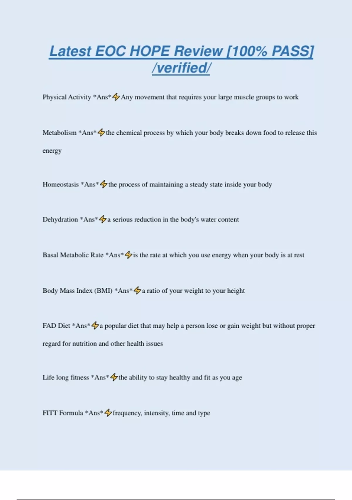Latest EOC HOPE Review [100% PASS] /verified/ Physical Activity *Ans* Any movement that requires your large muscle groups to work Metabolism *Ans* the chemical process by which your body breaks down food to release this energy Homeostasis *Ans* the process of maintaining a steady state inside your body Dehydration *Ans* a serious reduction in the body's water content Basal Metabolic Rate *Ans* is the rate at which you use energy when your body is at rest Body Mass Index (BMI) *Ans* a ratio of your weight to your height FAD Diet *Ans* a popular diet that may help a person lose or gain weight but without proper regard for nutrition and other health issues Life long fitness *Ans* the ability to stay healthy and fit as you age FITT Formula *Ans* frequency, intensity, time and type Target Heart Rate *Ans* is the rate at which your cardiovascular system receives the most benefits from exercise without working too hard Abstinence *Ans* a deliberate decision to avoid high-risk behaviors, including sexual activity and the use of tobacco, alcohol and other drugs Aerobic Exercise *Ans* All rhythmic activities that use large muscle groups for an extended period of time Active listening *Ans* paying close attention to what someone is saying and communicating Aggressive *Ans* Overly forceful, pushy or hostile. Anaerobic Exercise *Ans* Intense short bursts of activity in which the muscles work so hard that they produce energy without using oxygen Antibiotics *Ans* A class of chemical agents that destroy disease-causing microorganisms while leaving the patient unharmed Assertive *Ans* Expressing your views clearly and respectfu