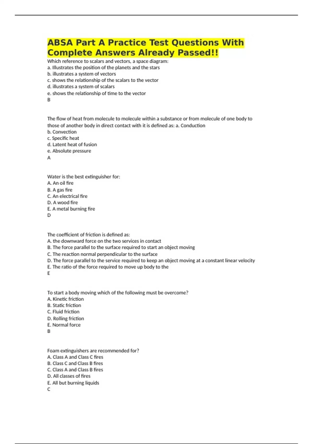 ABSA Part A Practice Test Questions With Complete Answers Already Passed!! Which reference to scalars and vectors, a space diagram: a. Illustrates the position of the planets and the stars b. illustrates a system of vectors c. shows the relationship of the scalars to the vector d. illustrates a system of scalars e. shows the relationship of time to the vector B The flow of heat from molecule to molecule within a substance or from molecule of one body to those of another body in direct contact with it is defined as: a. Conduction b. Convection c. Specific heat d. Latent heat of fusion e. Absolute pressure A Water is the best extinguisher for: A. An oil fire B. A gas fire C. An electrical fire D. A wood fire E. A metal burning fire D The coefficient of friction is defined as: A. the downward force on the two services in contact B. The force parallel to the surface required to start an object moving C. The reaction normal perpendicular to the surface D. The force parallel to the service required to keep an object moving at a constant linear velocity E. The ratio of the force required to move up body to the E To start a body moving which of the following must be overcome? A. Kinetic friction B. Static friction C. Fluid friction D. Rolling friction E. Normal force B Foam extinguishers are recommended for? A. Class A and Class C fires B. Class C and Class B fires C. Class A and Class B fires D. All classes of fires E. All but burning liquids C A control loop controller A. period does not require a set point value B. Sends a signal to a primary element C. Will always eliminate deviation D. Constantly compares input signals to the setpoint E. Send signal to the transmitter D The ratio between the ultimate strength and the allowable stress is defined as A.Ultimate stress B. Maximum allowable load C. Working stress D. Factor of safety E. Elastic limit D Which of the following constitutes a Class C fire? A. Fire in an electrical panel B. Fire in a fuel tank C. Fire in a lumber pile D. Fire in a coal bunker E. Fire in a pile of paper A The greatest load that can be applied to a material under is design conditions is called A. Ultimate stress B. Elastic limit C. Allowable stress D. Factor of safety E. Maximum allowable load E External tensile forces acting parallel but not in line produces: A. Tensile stress B. Compressive stress C. Working stress D. Shear stress E. Compressive strain D If an object is in motion along a fractional surface in a certain direction what will be the direction of frictional force exerted on that object? A. Same B. Opposite C. Perpendicular D. Angular with E. Angular against B Stepper motors have/are: A. Very high speed operation B. Minimum torque when at standstill C. Low reliability D. Slow starting E. Low efficiency E ____________are pieces of slag or tungsten that are trapped in a weld deposit A. Porosity B. Undercut C. Incomplete fusion D. Incomplete penetration E. Inclusions E NDIR Detectors detect: A. CO/CO2 B. SO2 C. NOx D. Relative humidity E. CH4 A Brass is an alloy of A.Copper and bronze B.Copper and lead C. Brass and lead D. Copper and tin E. Copper and zinc E The area under a velocity vs. time graph equal: a. Distance b. Speed c. Acceleration d. Displacement e. Average velocity D A single vector which can replace a system of actors and has the same effect is called a a complainer vector b resultant c concurrent factor D scholar E concentric vector B Which of the following is an advantage of gear drives over belt drives? a overall drive length can be longer b there is no slippage c. gear drives require minimal maintenance d. gear drives are more versatile e. gear drives requires no maintenance B In a Venturi tube blank or more of the upstream pressure is recovered down stream A.80% B. 90% C. 70% D. 100% E. 60% B Ammeters are connected with the negative or black lead connected to the? A. positive side of the circuit B. north pole of the circuit C. Negative side of the circuit D. Switch of the circuit E. Neutral side of the circuit C Any substance which cannot be broken down into other substances or ingredients by chemical means is? A. A mixture B. A compound C. An electron D. An atom E. An element E The periodic table A. Arranges elements in equal numbers of columns and rows B. Arranges elements in descending order of atomic number C. Reflects the similar chemical properties of some elements D. Has 16 distinct groups E. Provides no information besides the chemical symbol of the element C All maintenance work done on portable fire extinguishers is required to be: A. Completed on all extinguishers in the plant at the same time B. Performed at the worksite in case they are required for emergency service C. Contracted out to a certified service company D. Supervised by national fire protection Association employee E. Performed on an as needed basis C The basic unit of thermal dynamic temperature in the S I system is? A. Metre B. Kilograms C. Celsius D. Ampere E. Calvin E The oldest form of welding is? A. Forge welding B. Resistance welding C. Spot welding D. Electric arc welding E. Plasma arc welding A Which of the following is not a scaler quantity? A. Velocity B. Length C. Volume D. Time E. Area A A fourth class engineers certificate of competency qualifies the holder to take charge of a power plant as an assistant shift engineer not exceeding A. 1000 kW B. 10 MW C. 10,000 W D. 1500 kW E. 5000 kW B Brazing is done at a temperature A. Below 450°C B. Above 450°C C. Above 900°C D. Above 1000°C E. Above 1650°C B A supplier label can... A. Have a solid border at certain times B. Be replaced by a workplace label C. Show no more than three symbols D. Be removed at any time E. Never be rectangular B Soldering is done at temperatures... A. Above 450°C B. Below 450°C C. Above 500°C D. Below 650°C E. Below 1650°C B The material safety data sheet is supplied by the