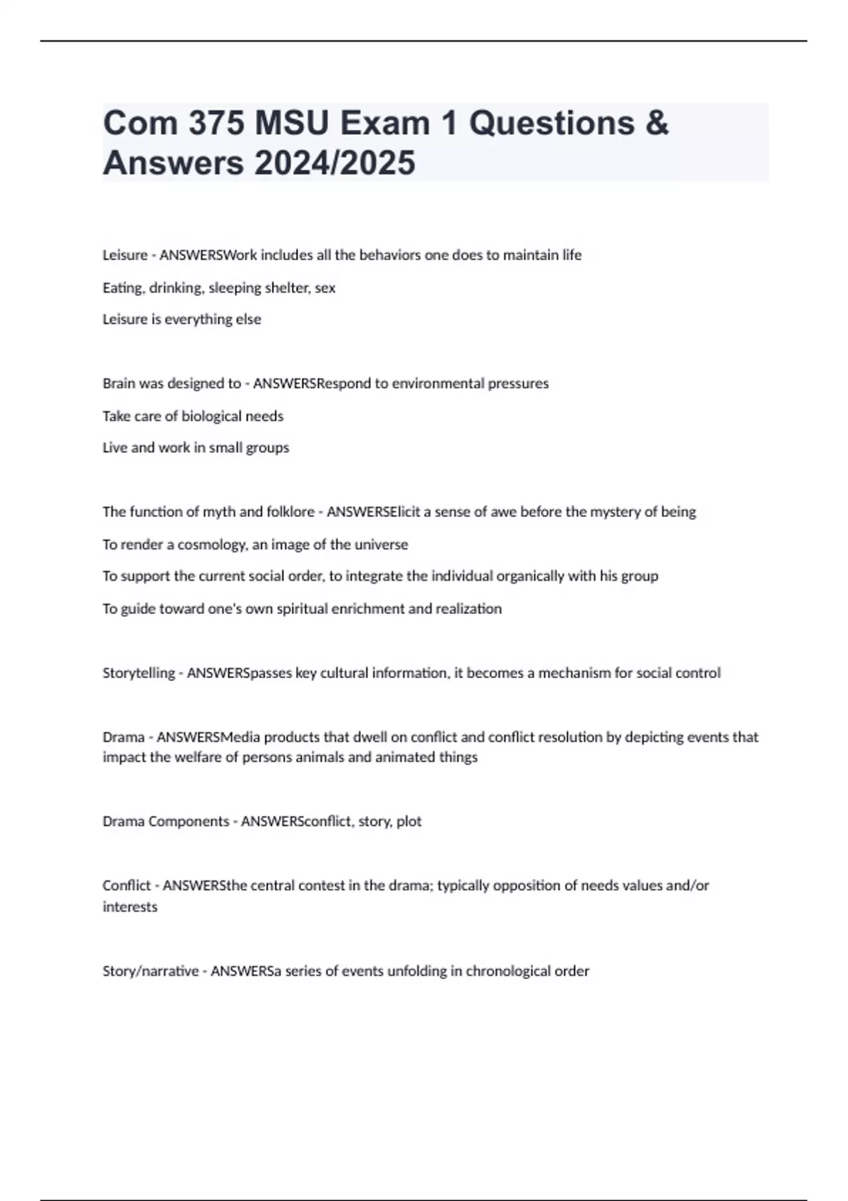 Com 375 MSU Exam 1 Questions & Answers 2024/2025 Leisure - ANSWERSWork includes all the behaviors one does to maintain life Eating, drinking, sleeping shelter, sex Leisure is everything else Brain was designed to - ANSWERSRespond to environmental pressures Take care of biological needs Live and work in small groups The function of myth and folklore - ANSWERSElicit a sense of awe before the mystery of being To render a cosmology, an image of the universe To support the current social order, to integrate the individual organically with his group To guide toward one's own spiritual enrichment and realization Storytelling - ANSWERSpasses key cultural information, it becomes a mechanism for social control Drama - ANSWERSMedia products that dwell on conflict and conflict resolution by depicting events that impact the welfare of persons animals and animated things Drama Components - ANSWERSconflict, story, plot Conflict - ANSWERSthe central contest in the drama; typically opposition of needs values and/or interests Story/narrative - ANSWERSa series of events unfolding in chronological order