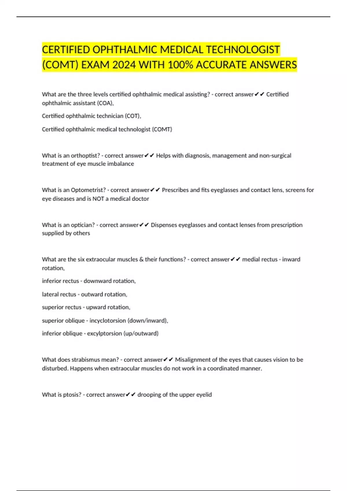 CERTIFIED OPHTHALMIC MEDICAL TECHNOLOGIST (COMT) EXAM 2024 WITH 100% ACCURATE ANSWERS What are the three levels certified ophthalmic medical assisting? - correct answer Certified ophthalmic assistant (COA), Certified ophthalmic technician (COT), Certified ophthalmic medical technologist (COMT) What is an orthoptist? - correct answer Helps with diagnosis, management and non-surgical treatment of eye muscle imbalance What is an Optometrist? - correct answer Prescribes and fits eyeglasses and contact lens, screens for eye diseases and is NOT a medical doctor What is an optician? - correct answer Dispenses eyeglasses and contact lenses from prescription supplied by others What are the six extraocular muscles & their functions? - correct answer medial rectus - inward rotation, inferior rectus - downward rotation, lateral rectus - outward rotation, superior rectus - upward rotation, superior oblique - incyclotorsion (down/inward), inferior oblique - excylptorsion (up/outward) What does strabismus mean? - correct answer Misalignment of the eyes that causes vision to be disturbed. Happens when extraocular muscles do not work in a coordinated manner. What is ptosis? - correct answer drooping of the upper eyelid