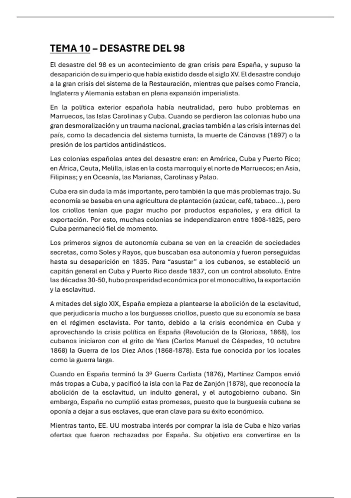 Sumario Resumen desastre del 98 - Historia de España - Selectividad
