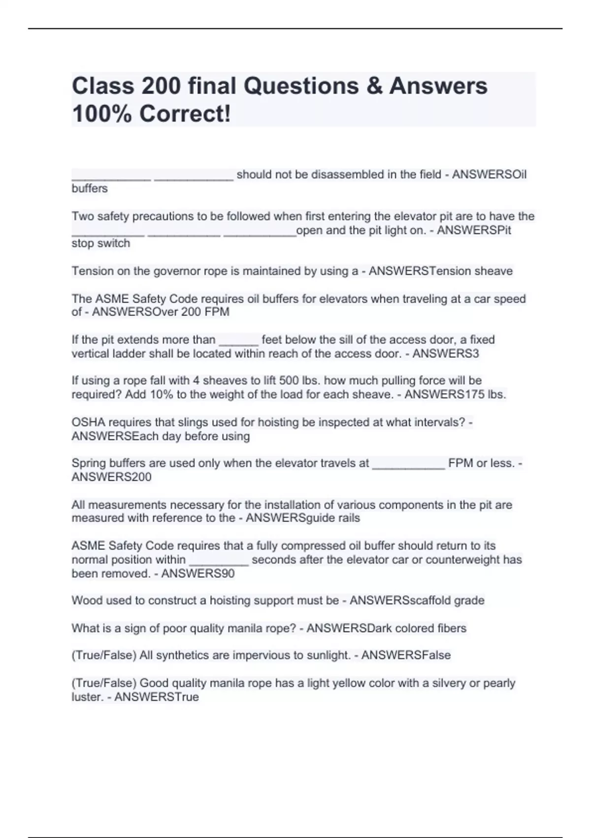 ____________ ____________ should not be disassembled in the field - ANSWERSOil buffers Two safety precautions to be followed when first entering the elevator pit are to have the ___________ ___________ ___________open and the pit light on. - ANSWERSPit stop switch Tension on the governor rope is maintained by using a - ANSWERSTension sheave The ASME Safety Code requires oil buffers for elevators when traveling at a car speed of - ANSWERSOver 200 FPM If the pit extends more than ______ feet below the sill of the access door, a fixed vertical ladder shall be located within reach of the access door. - ANSWERS3 If using a rope fall with 4 sheaves to lift 500 lbs. how much pulling force will be required? Add 10% to the weight of the load for each sheave. - ANSWERS175 lbs. OSHA requires that slings used for hoisting be inspected at what intervals? - ANSWERSEach day before using Spring buffers are used only when the elevator travels at ___________ FPM or less. - ANSWERS200 All measurements necessary for the installation of various components in the pit are measured with reference to the - ANSWERSguide rails ASME Safety Code requires that a fully compressed oil buffer should return to its normal position within _________ seconds after the elevator car or counterweight has been removed. - ANSWERS90 Wood used to construct a hoisting support must be - ANSWERSscaffold grade What is a sign of poor quality manila rope? - ANSWERSDark colored fibers (True/False) All synthetics are impervious to sunlight. - ANSWERSFalse (True/False) Good quality manila rope has a light yellow color with a silvery or pearly luster. - ANSWERSTrue