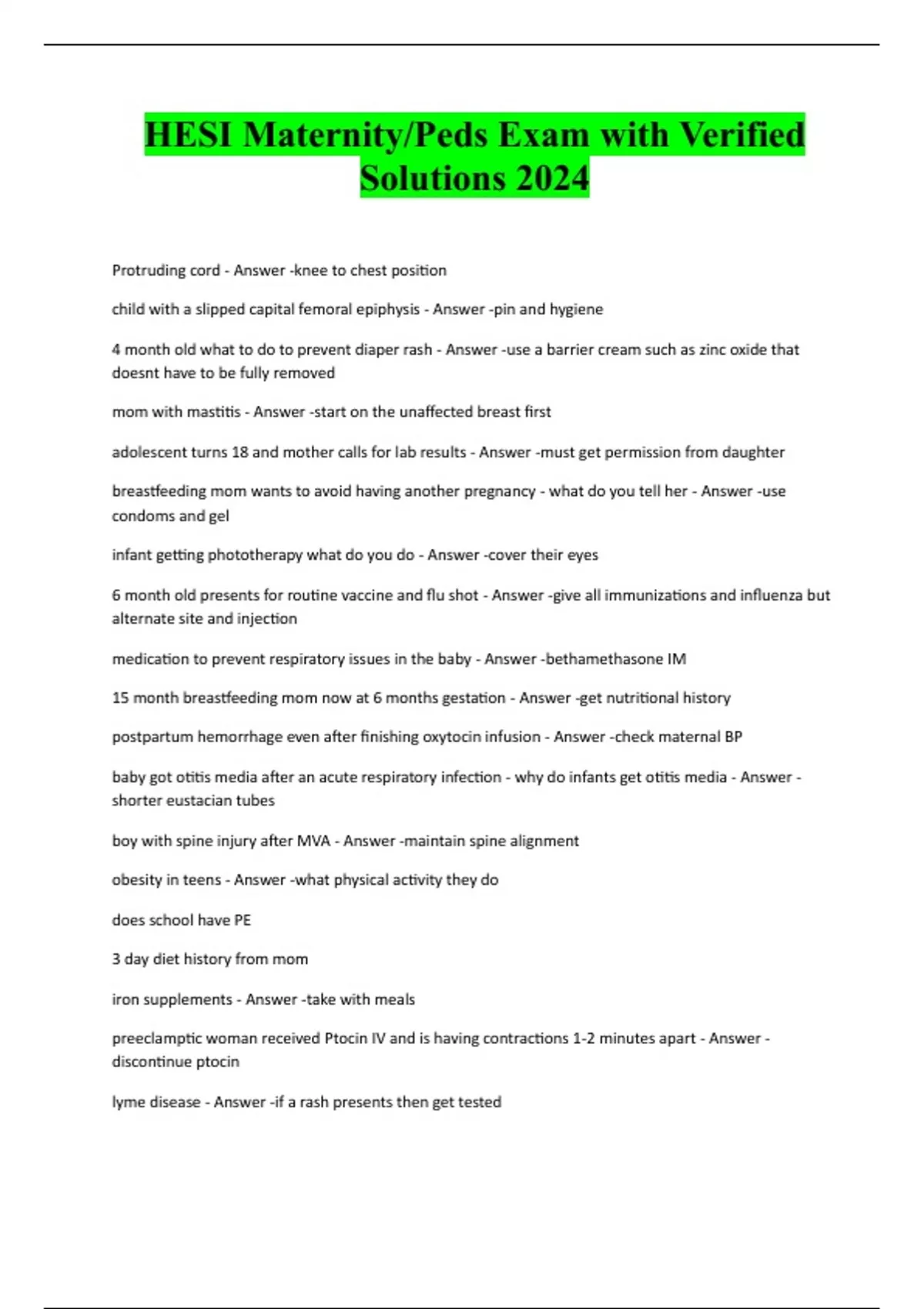 HESI Maternity/Peds Exam with Verified Solutions 2024 Protruding cord - Answer -knee to chest position child with a slipped capital femoral epiphysis - Answer -pin and hygiene 4 month old what to do to prevent diaper rash - Answer -use a barrier cream such as zinc oxide that doesnt have to be fully removed mom with mastitis - Answer -start on the unaffected breast first adolescent turns 18 and mother calls for lab results - Answer -must get permission from daughter breastfeeding mom wants to avoid having another pregnancy - what do you tell her - Answer -use condoms and gel infant getting phototherapy what do you do - Answer -cover their eyes 6 month old presents for routine vaccine and flu shot - Answer -give all immunizations and influenza but alternate site and injection medication to prevent respiratory issues in the baby - Answer -bethamethasone IM 15 month breastfeeding mom now at 6 months gestation - Answer -get nutritional histor