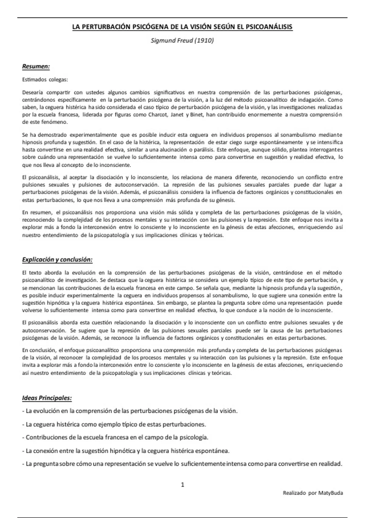 Resumen, explicación y conclusión, e ideas principales del texto 'La Perturbación Psicógena de la Visión Según el Psicoanálisis' de Freud.