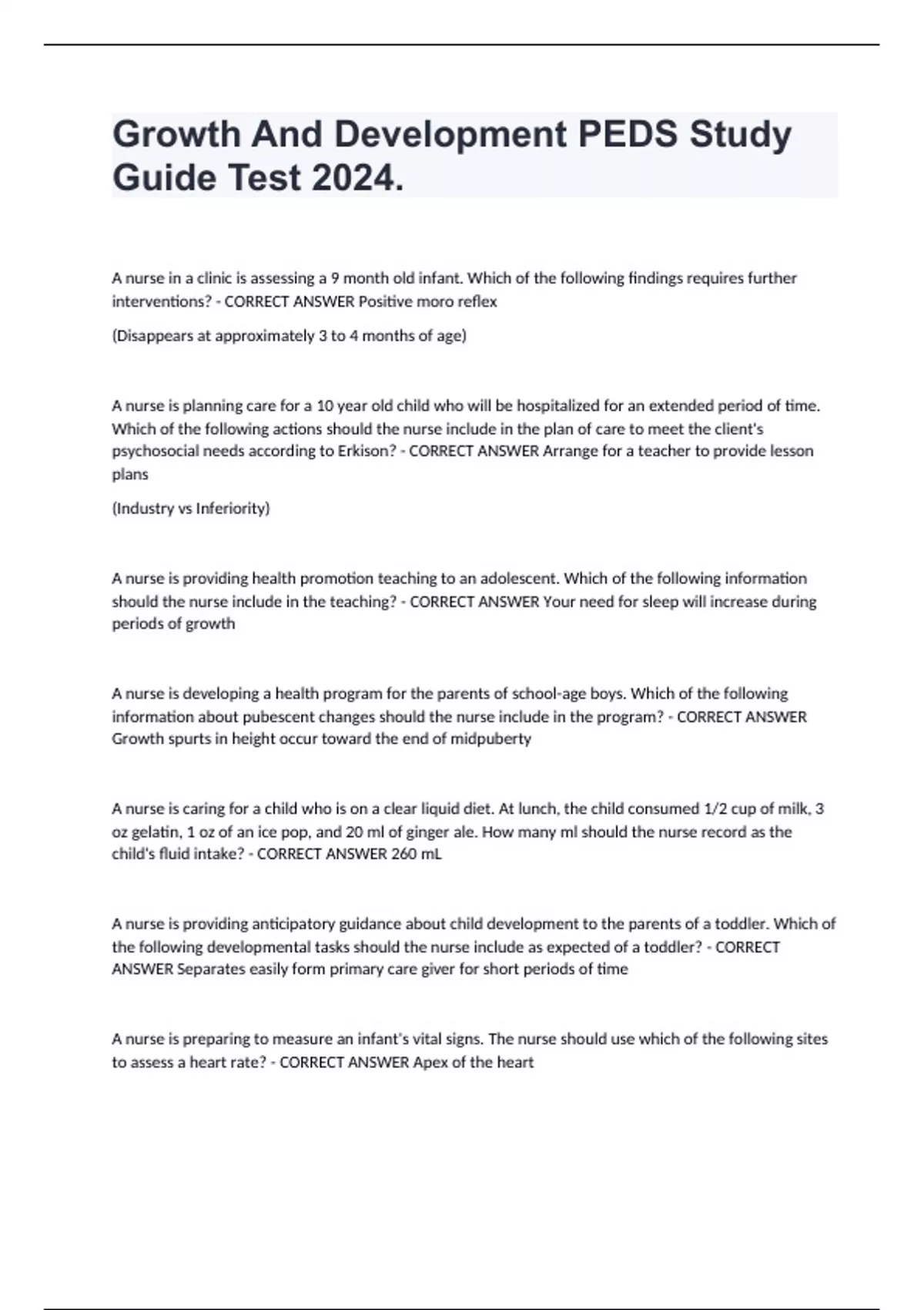 Growth And Development PEDS Study Guide Test 2024. A nurse in a clinic is assessing a 9 month old infant. Which of the following findings requires further interventions? - CORRECT ANSWER Positive moro reflex (Disappears at approximately 3 to 4 months of age) A nurse is planning care for a 10 year old child who will be hospitalized for an extended period of time. Which of the following actions should the nurse include in the plan of care to meet the client's psychosocial needs according to Erkison? - CORRECT ANSWER Arrange for a teacher to provide lesson plans (Industry vs Inferiority) A nurse is providing health promotion teaching to an adolescent. Which of the following information should the nurse include in the teaching? - CORRECT ANSWER Your need for sleep will increase during periods of growth A nurse is developing a health program for the parents of school-age boys. Which of the following information about pubescent changes should the nurse include in the program? - CORRECT ANSWER Growth spurts in height occur toward the end of midpuberty A nurse is caring for a child who is on a clear liquid diet. At lunch, the child consumed 1/2 cup of milk, 3 oz gelatin, 1 oz of an ice pop, and 20 ml of ginger ale. How many ml should the nurse record as the child's fluid intake? - CORRECT ANSWER 260 mL A nurse is providing anticipatory guidance about child development to the parents of a toddler. Which of the following developmental tasks should the nurse include as expected of a toddler? - CORRECT ANSWER Separates easily form primary care giver for short periods of time A nurse is preparing to measure an infant's vital signs. The nurse should use which of the following sites to assess a heart rate? - CORRECT ANSWER Apex of the heart