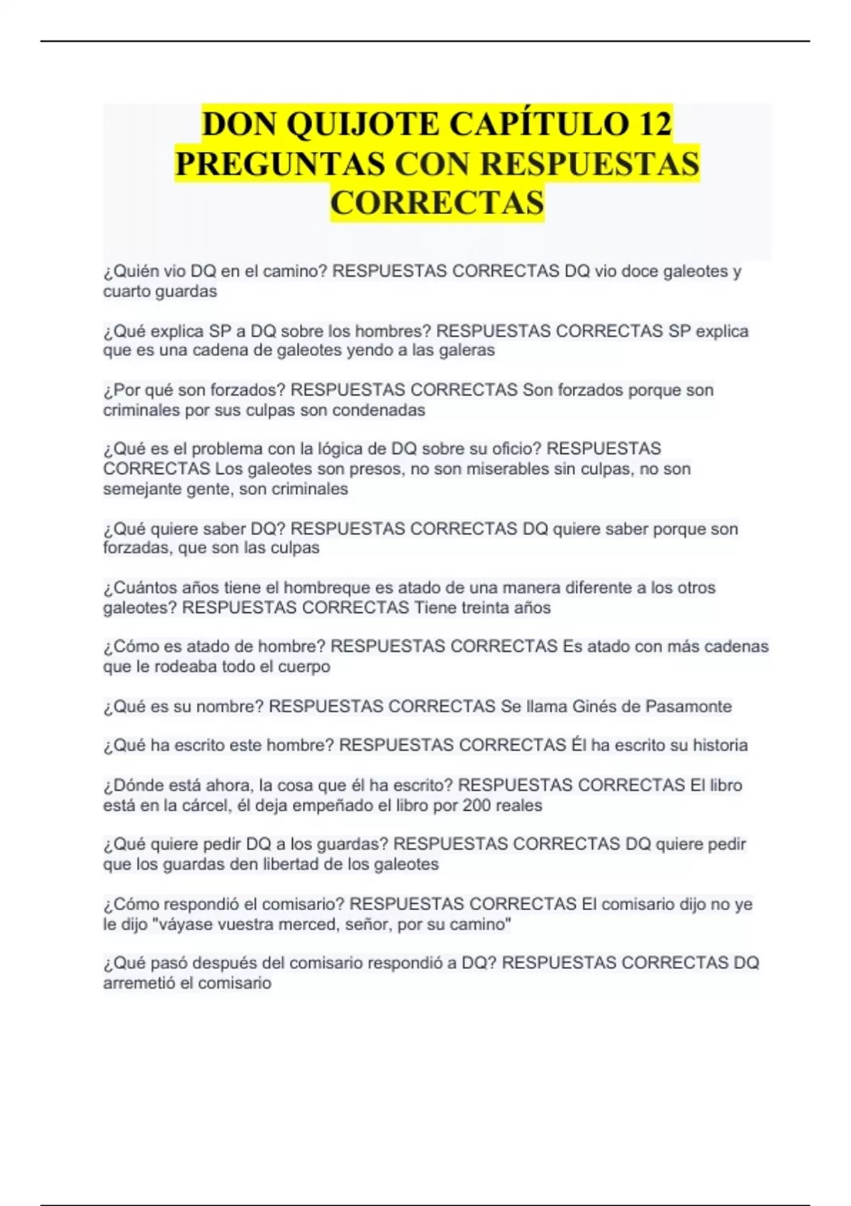 DON QUIJOTE CAPÍTULO 12 PREGUNTAS CON RESPUESTAS CORRECTAS|100% verified