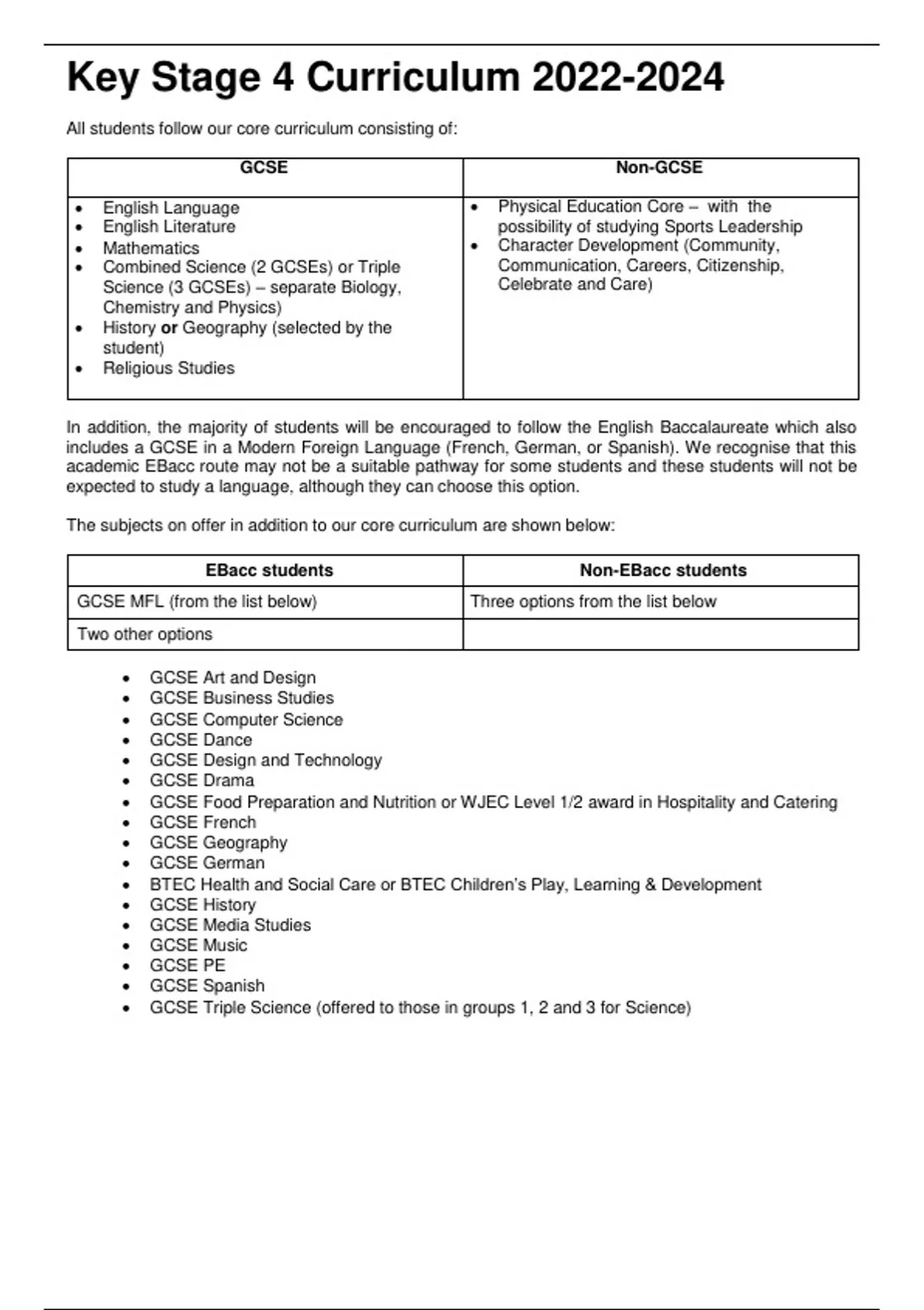 In addition, the majority of students will be encouraged to follow the English Baccalaureate which also