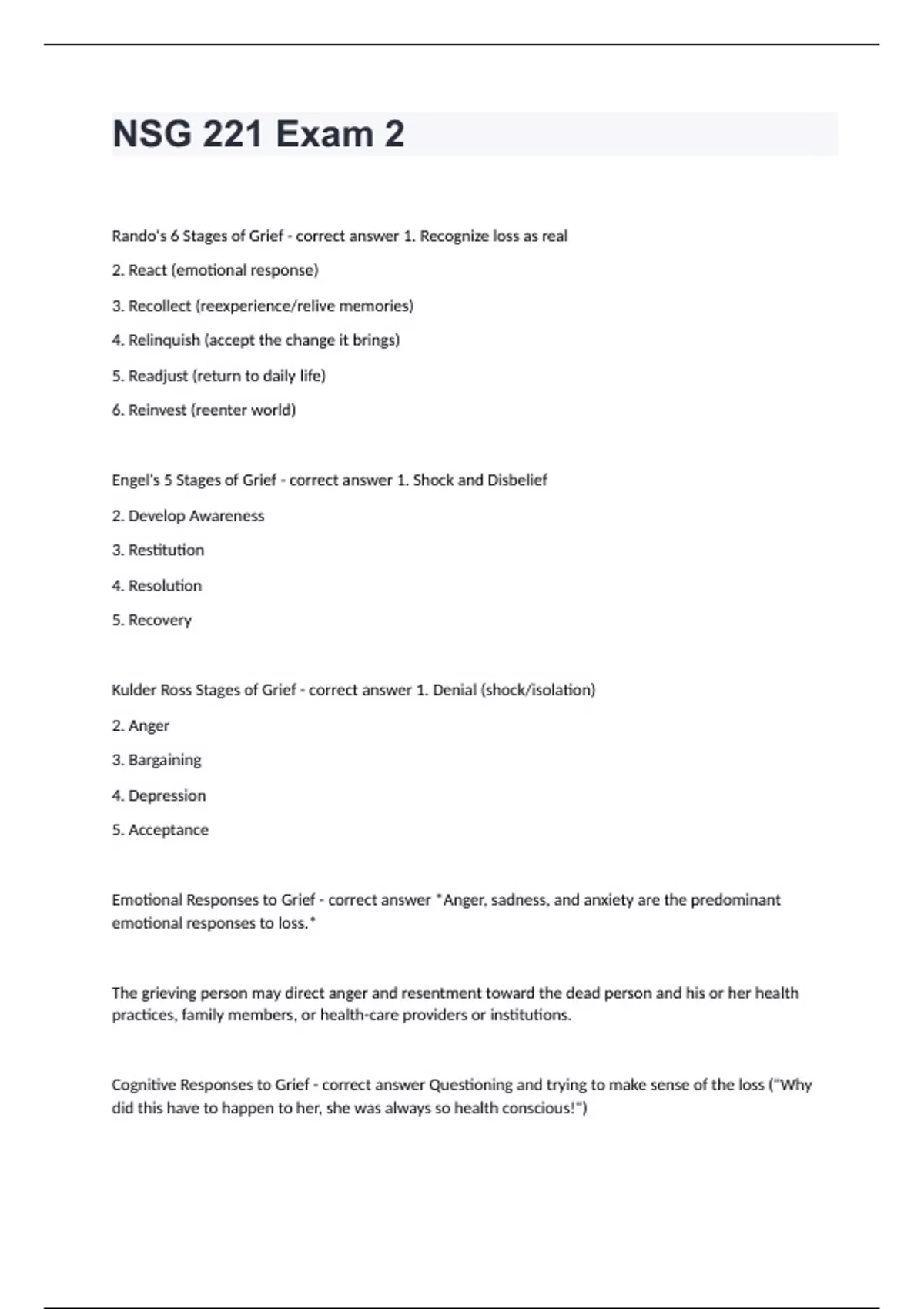 NSG 221 Exam 2 Herzing University - Question and answers rated A+ NSG 221 Exam 2 Rando's 6 Stages of Grief - correct answer 1. Recognize loss as real 2. React (emotional response) 3. Recollect (reexperience/relive memories) 4. Relinquish (accept the change it brings) 5. Readjust (return to daily life) 6. Reinvest (reenter world) Engel's 5 Stages of Grief - correct answer 1. Shock and Disbelief 2. Develop Awareness 3. Restitution 4. Resolution 5. Recovery Kulder Ross Stages of Grief - correct answer 1. Denial (shock/isolation) 2. Anger 3. Bargaining 4. Depression 5. Acceptance