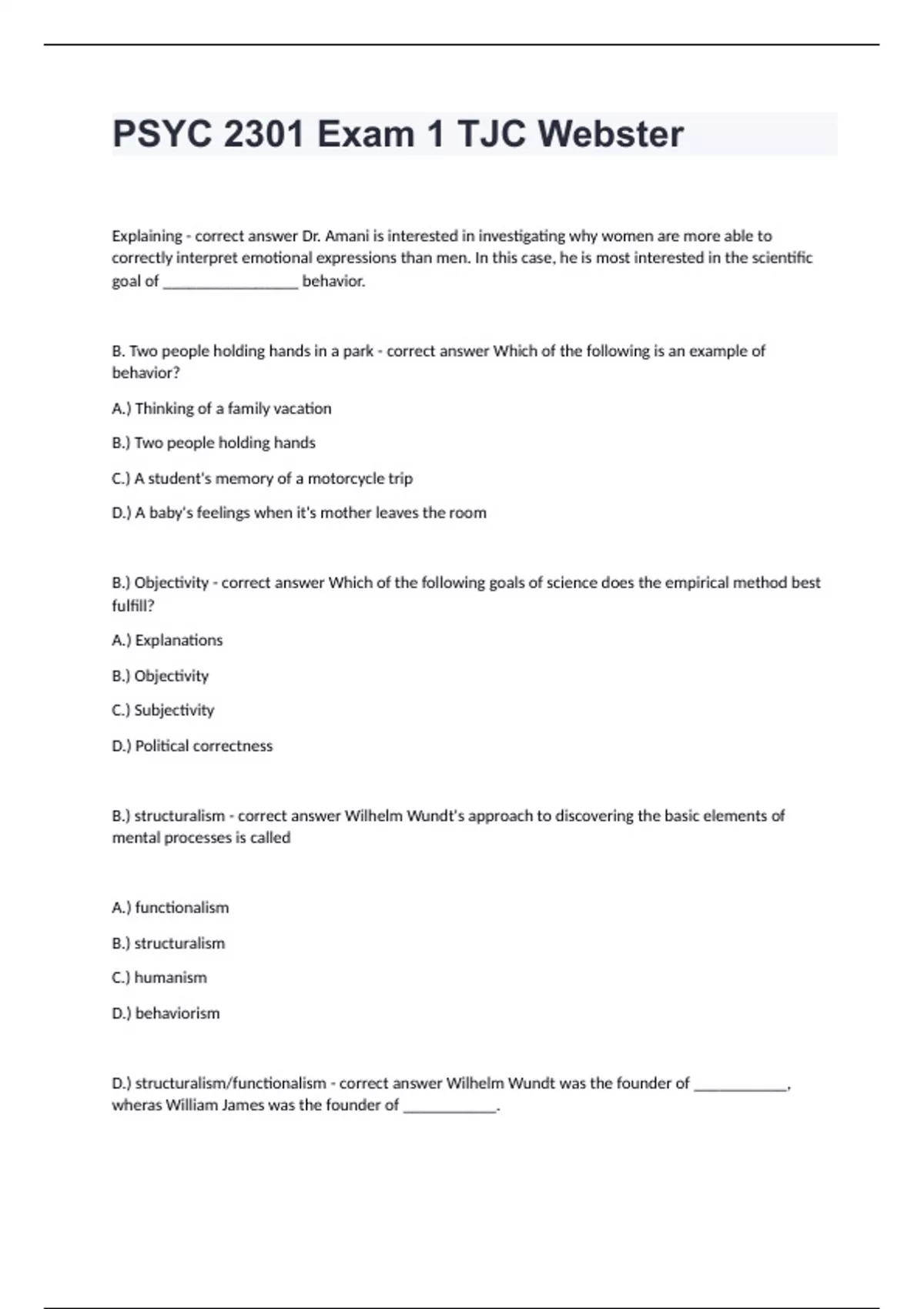 PSYC 2301 Exam 1 TJC WebsterExplaining - correct answer Dr. Amani is interested in investigating why women are more able to correctly interpret emotional expressions than men. In this case, he is most interested in the scientific goal of ________________ behavior. B. Two people holding hands in a park - correct answer Which of the following is an example of behavior? A.) Thinking of a family vacation B.) Two people holding hands C.) A student's memory of a motorcycle trip D.) A baby's feelings when it's mother leaves the room B.) Objectivity - correct answer Which of the following goals of science does the empirical method best fulfill? A.) Explanations B.) Objectivity C.) Subjectivity D.) Political correctness B.) structuralism - correct answer Wilhelm Wundt's approach to discovering the basic elements of mental processes is called A.) functionalism B.) structuralism C.) humanism D.) behaviorism D.) structuralism/functionalism - correct answer Wilhelm Wundt was the founder of ___________, wheras William James was the founder of ___________.