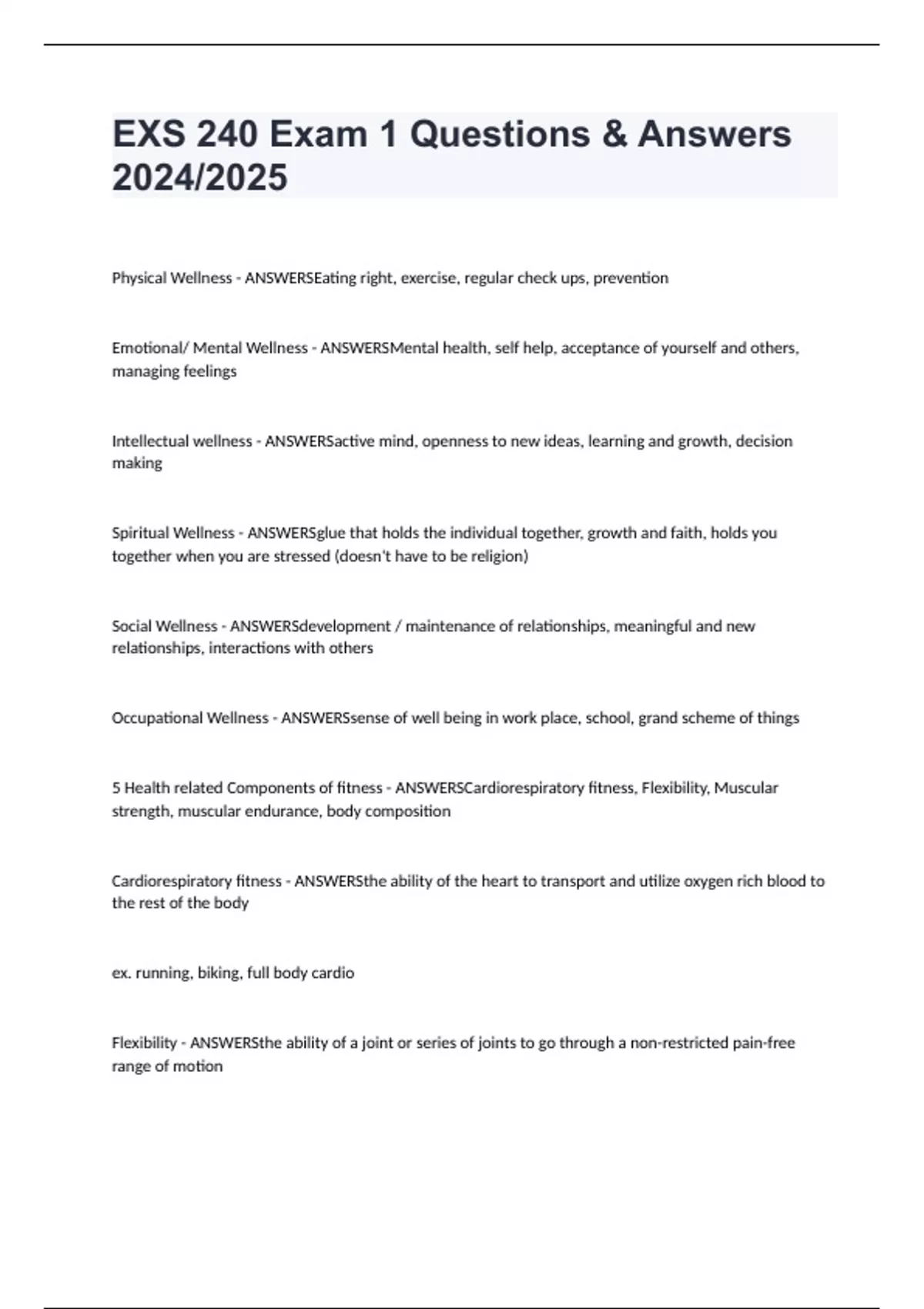 EXS 240 Exam 1 Questions & Answers 2024/2025 Physical Wellness - ANSWERSEating right, exercise, regular check ups, prevention Emotional/ Mental Wellness - ANSWERSMental health, self help, acceptance of yourself and others, managing feelings Intellectual wellness - ANSWERSactive mind, openness to new ideas, learning and growth, decision making Spiritual Wellness - ANSWERSglue that holds the individual together, growth and faith, holds you together when you are stressed (doesn't have to be religion) Social Wellness - ANSWERSdevelopment / maintenance of relationships, meaningful and new relationships, interactions with others Occupational Wellness - ANSWERSsense of well being in work place, school, grand scheme of things 5 Health related Components of fitness - ANSWERSCardiorespiratory fitness, Flexibility, Muscular strength, muscular endurance, body composition Cardiorespiratory fitness - ANSWERSthe ability of the heart to transport and utilize oxygen rich blood to the rest of the body ex. running, biking, full body cardio Flexibility - ANSWERSthe ability of a joint or series of joints to go through a non-restricted pain-free range of motion