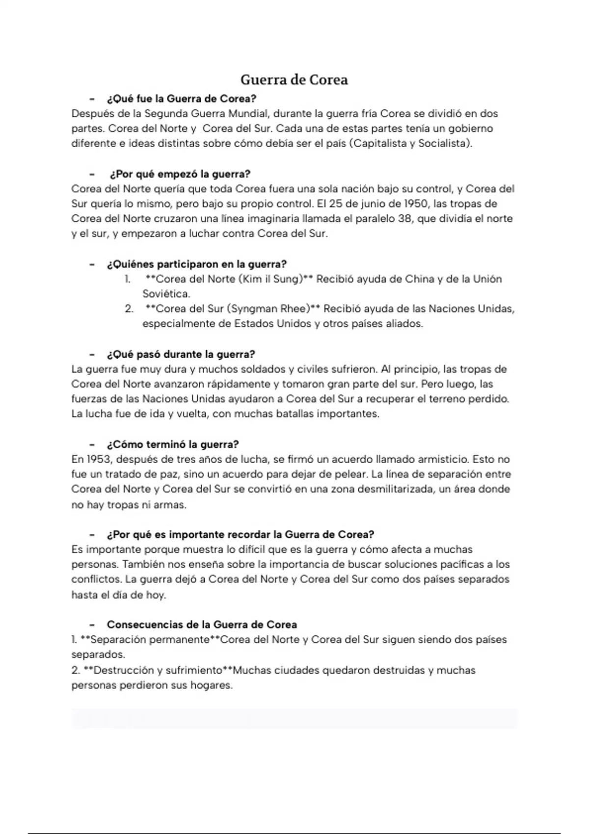 En este documento puedes ver apuntes puntuales y súper simplificados sobre la guerra de corea.