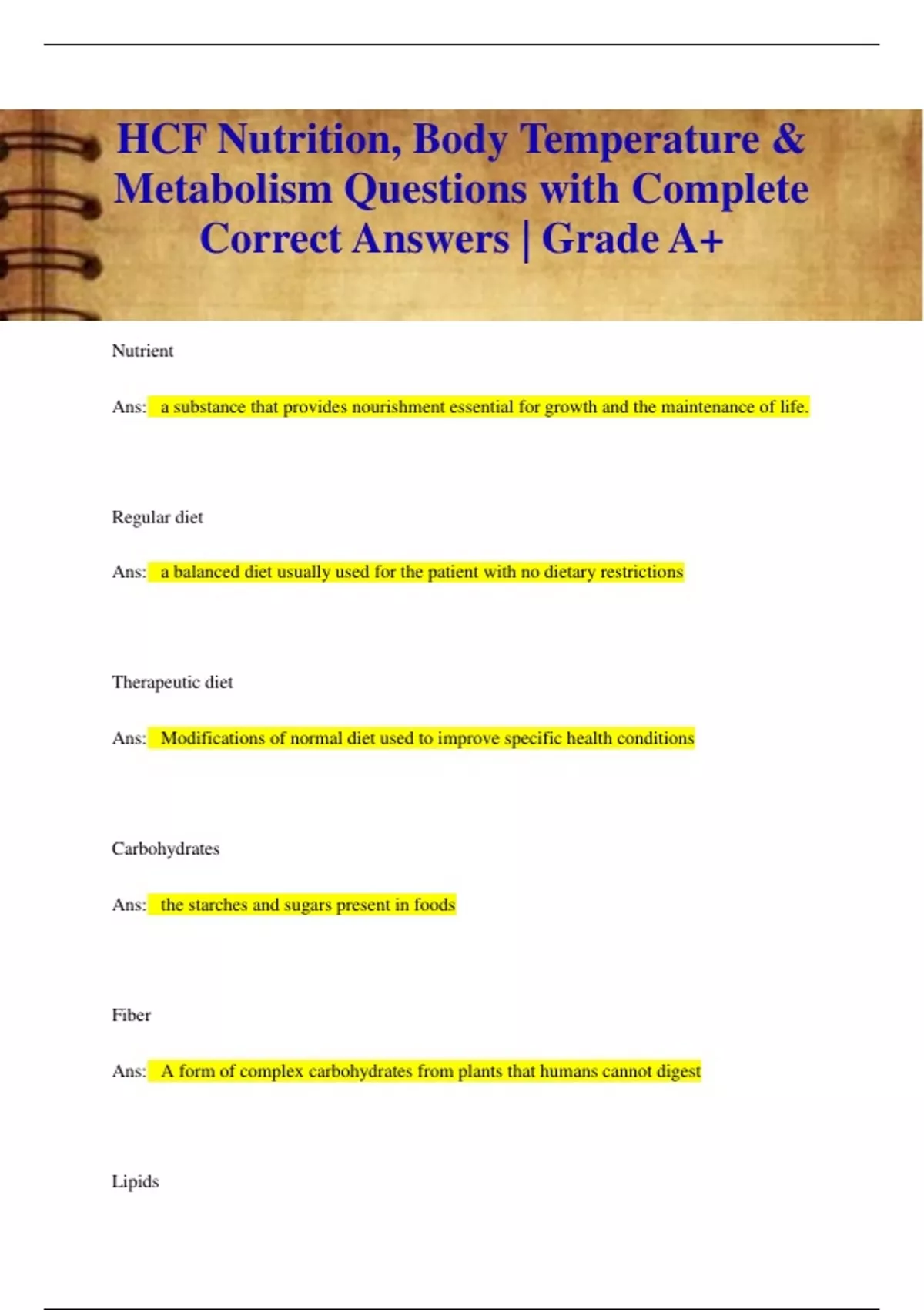HCF Nutrition, Body Temperature & Metabolism Questions with Complete Correct Answers | Grade A+ Nutrient Ans: a substance that provides nourishment essential for growth and the maintenance of li